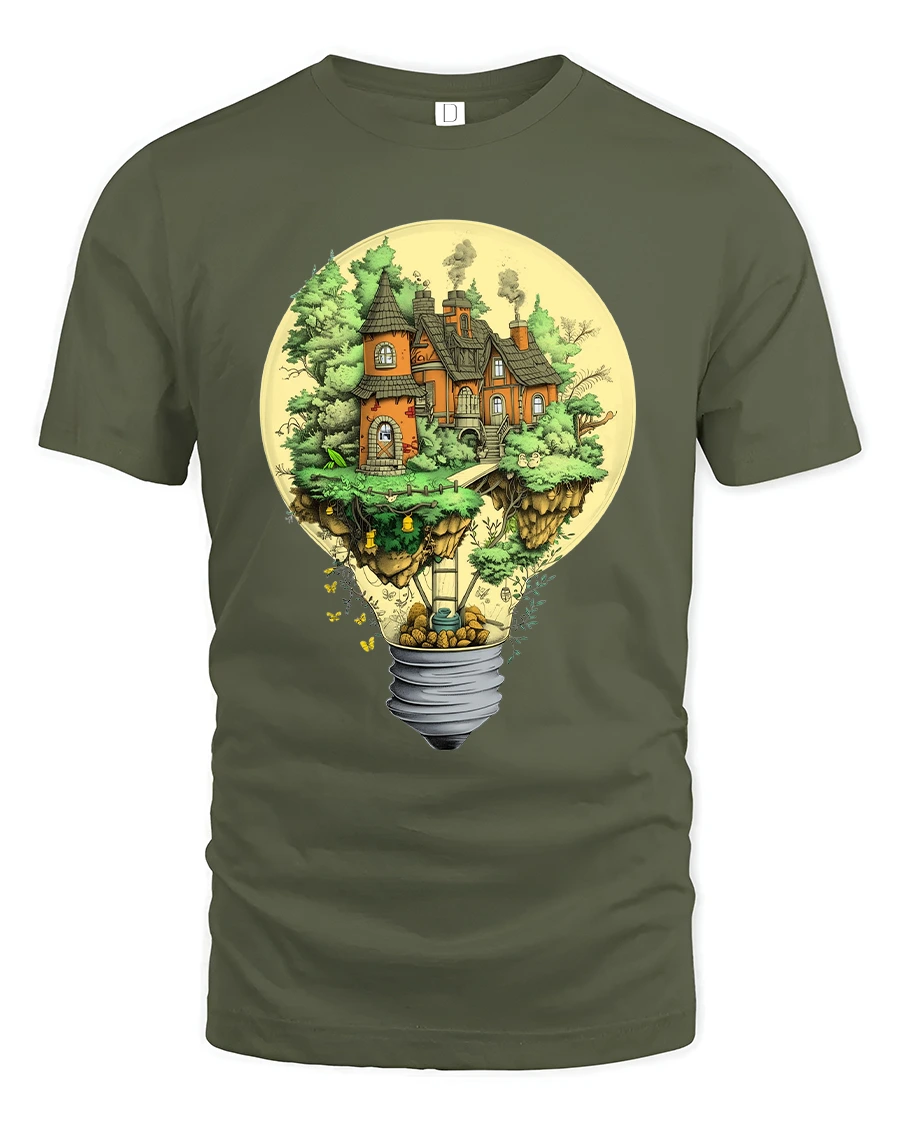 Fantasy Lightbulb House Tee Creative Floating Cottage Tshirt - military green t-shirt on white background