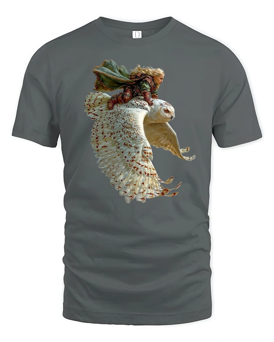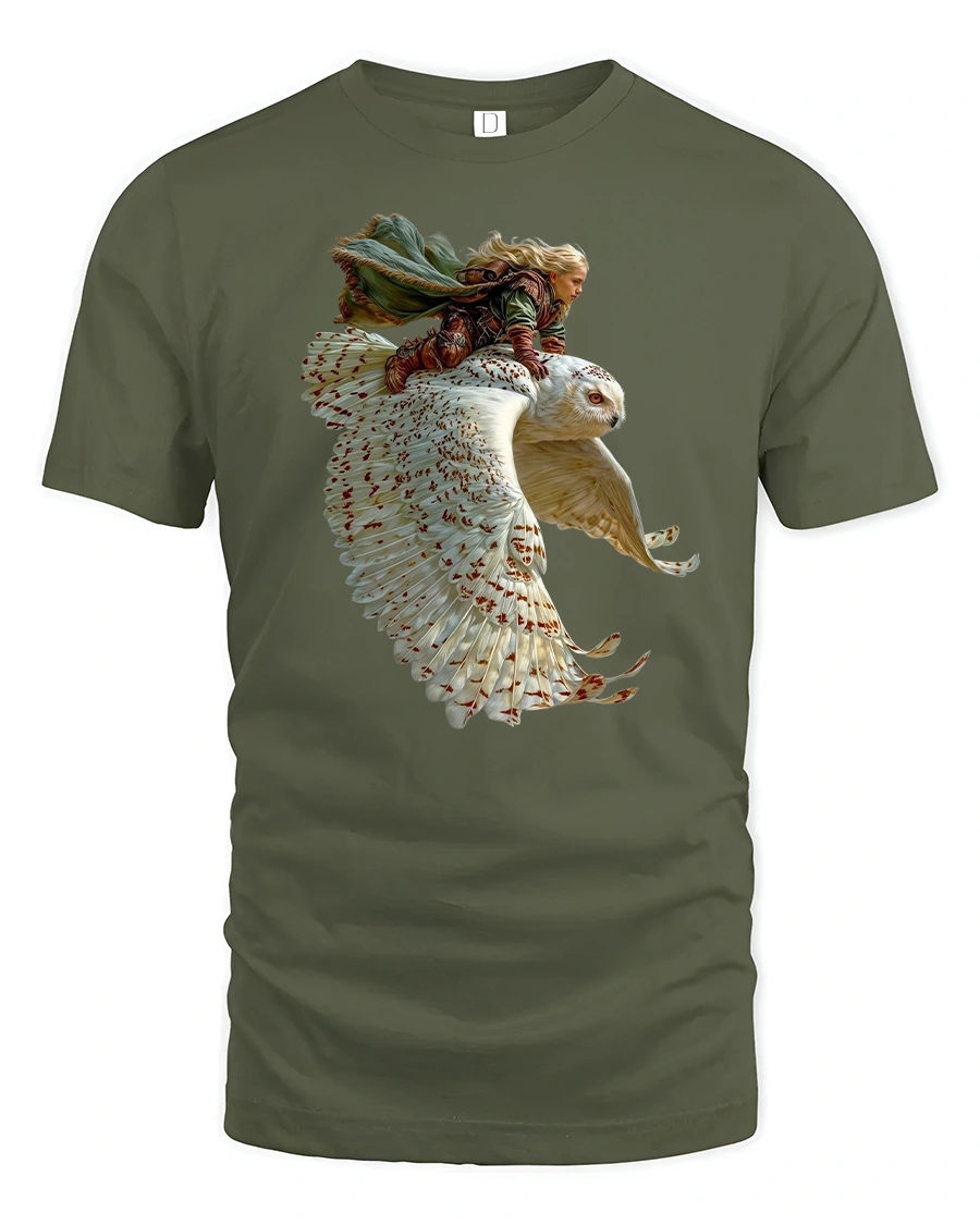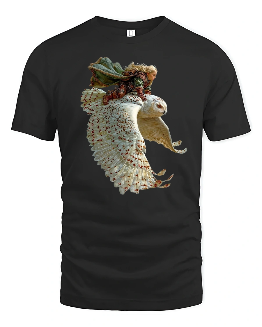 Featuring a fearless warrior riding a majestic owl in mid-flight, this shirt captures the magic of adventure and the thrill of mythical journeys.