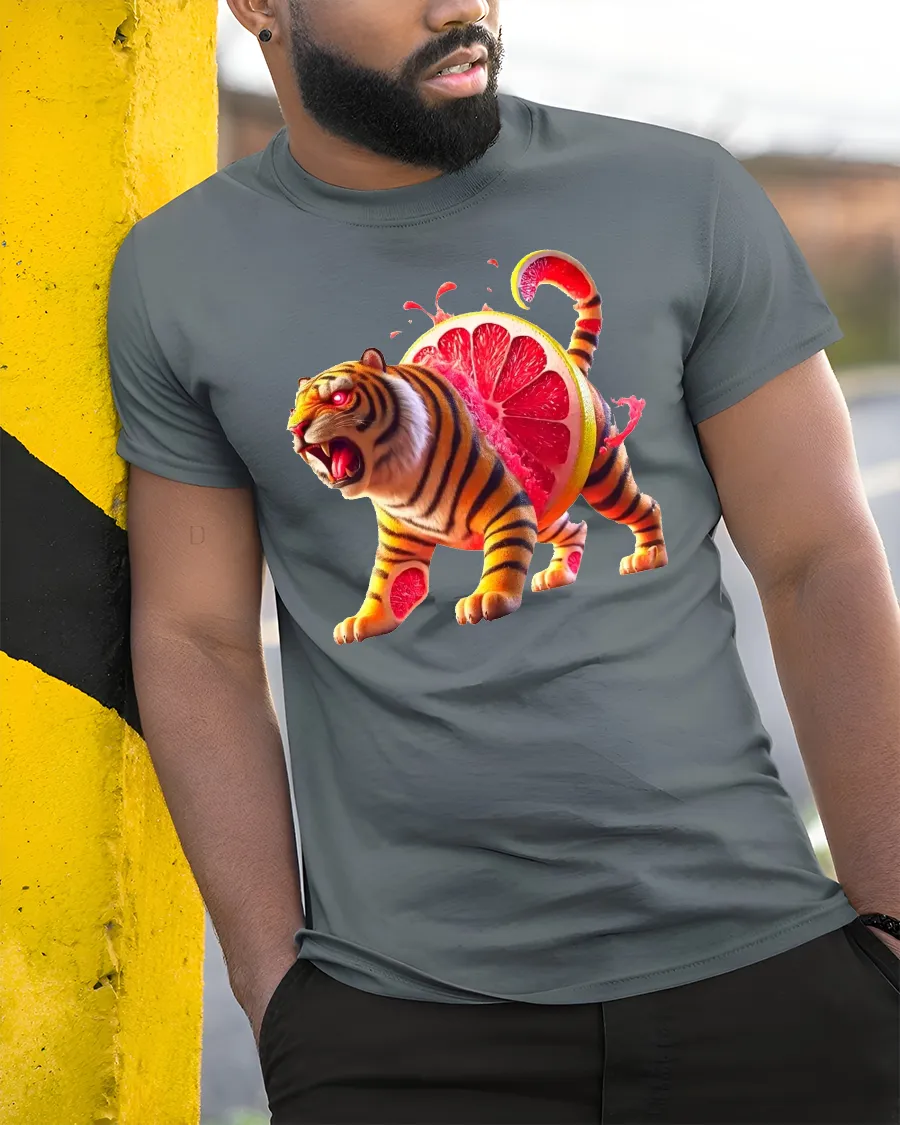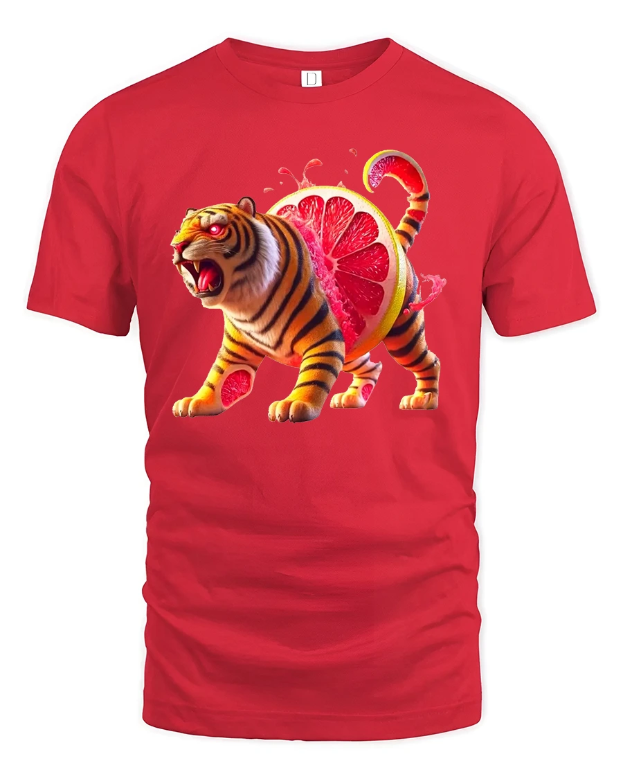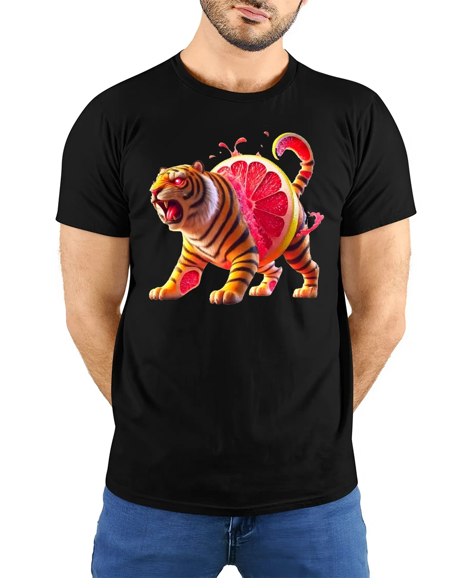 Wearing the Ferocious Citrus Tiger Tee with Vibrant Grapefruit Art Print is a great way to spark conversations and share your love for quirky, imaginative art. The bright orange and pink hues pop beautifully, making the shirt visually striking and memorable. Fans of animals, fantasy art, or humorous mash-up graphics will appreciate this fierce yet fruity design.