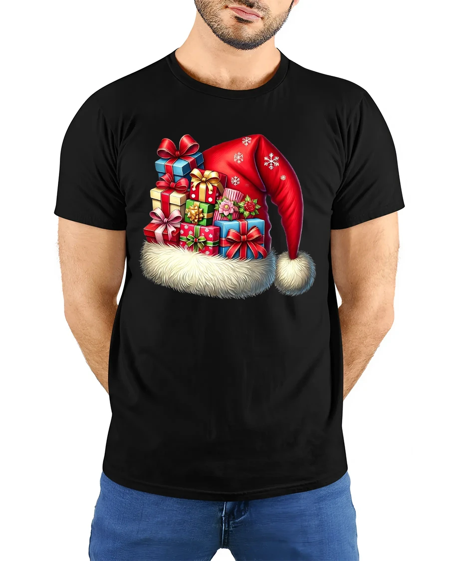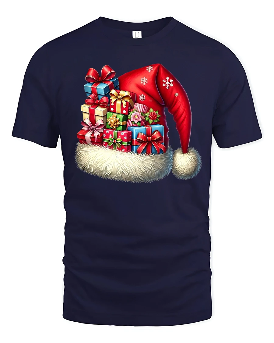 The Festive Santa Hat Gift Stack Tee With Cozy Holiday Cheer is a joyful addition to any holiday wardrobe.