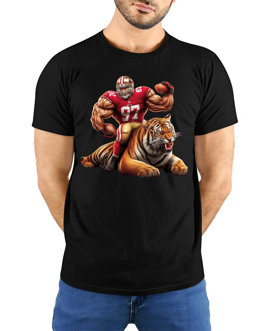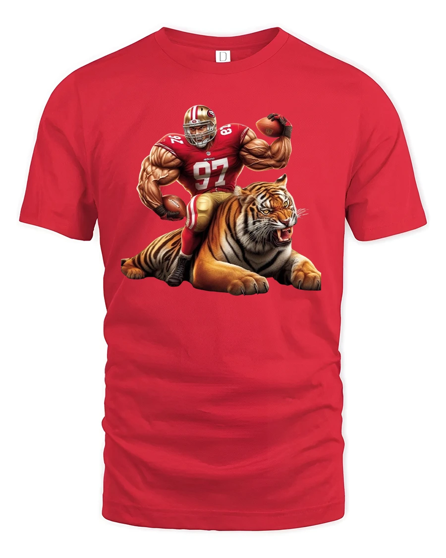 Fierce Football Player and Tiger Power Graphic Tee is the ultimate shirt for fans who love bold, eye-catching sports designs. Featuring a muscular football player riding a powerful tiger, this tee combines the strength of the game with the wild spirit of nature. The unique artwork makes it perfect for sports lovers, athletes, or anyone who wants to stand out with an edgy look.