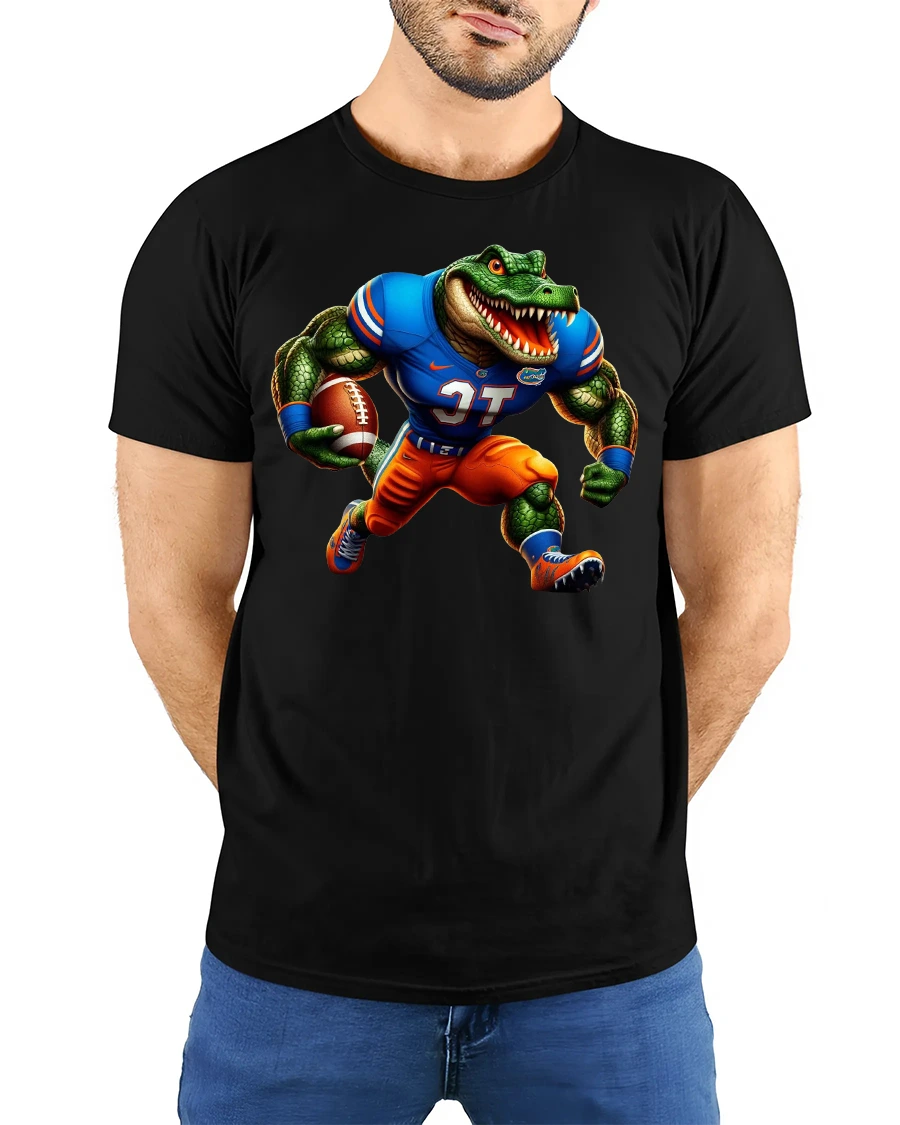 Featuring a powerful alligator charging forward with a football in hand, this bold design brings together the energy of sports and the strength of nature.