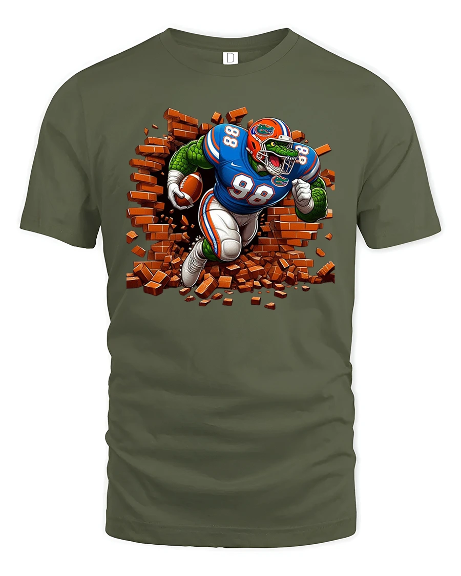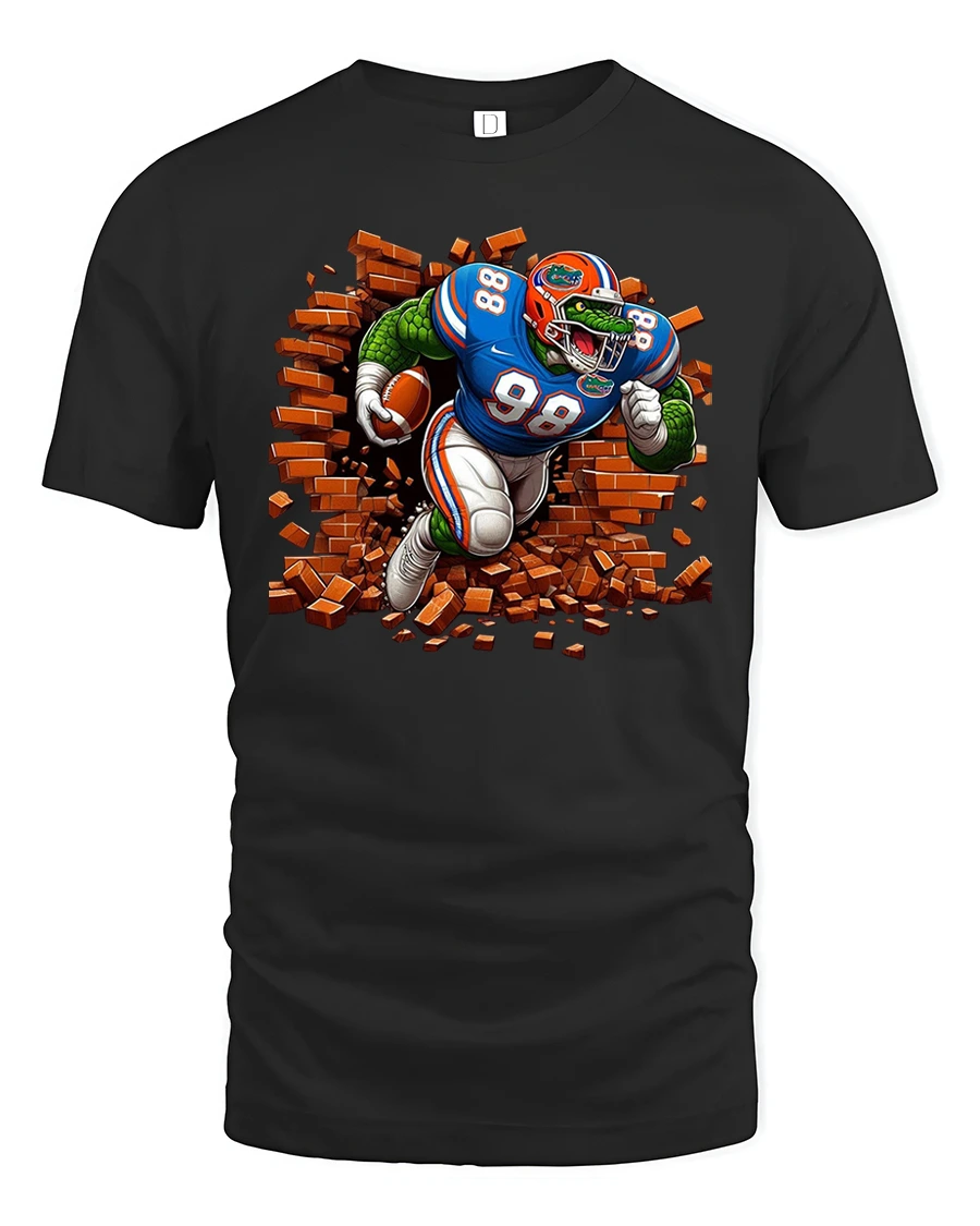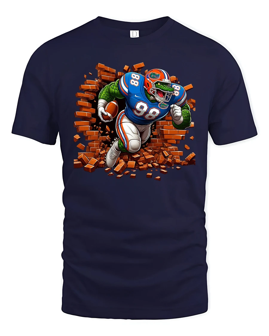 Featuring a powerful alligator football player breaking through a brick wall, this tee symbolizes strength, determination, and fearless play.