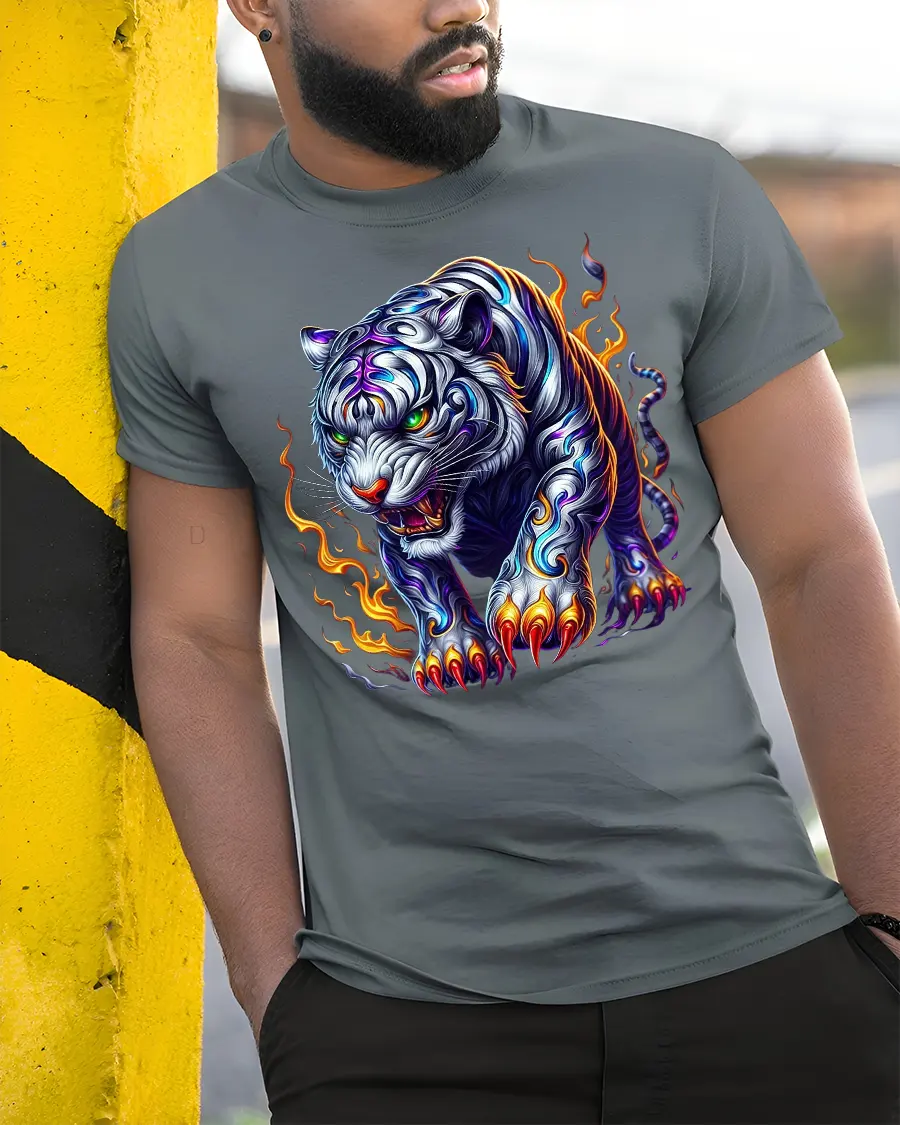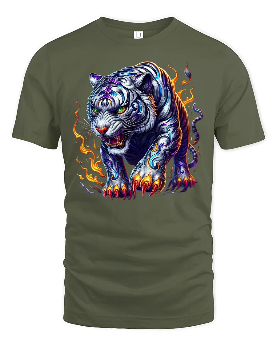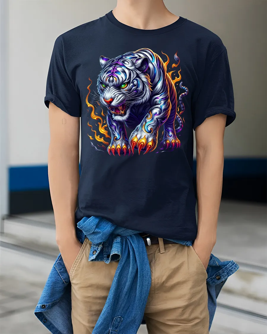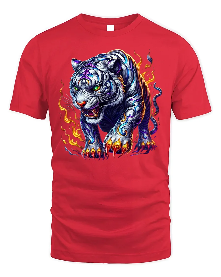 Fierce White Tiger with Flames Graphic T-Shirt is designed for those who want to show strength, courage, and style through bold fashion. Featuring a powerful white tiger surrounded by flames and glowing with fierce energy, this striking artwork captures the raw spirit of the wild. The detailed claws, fiery accents, and glowing eyes make it a truly unforgettable design for animal and fantasy lovers alike.
