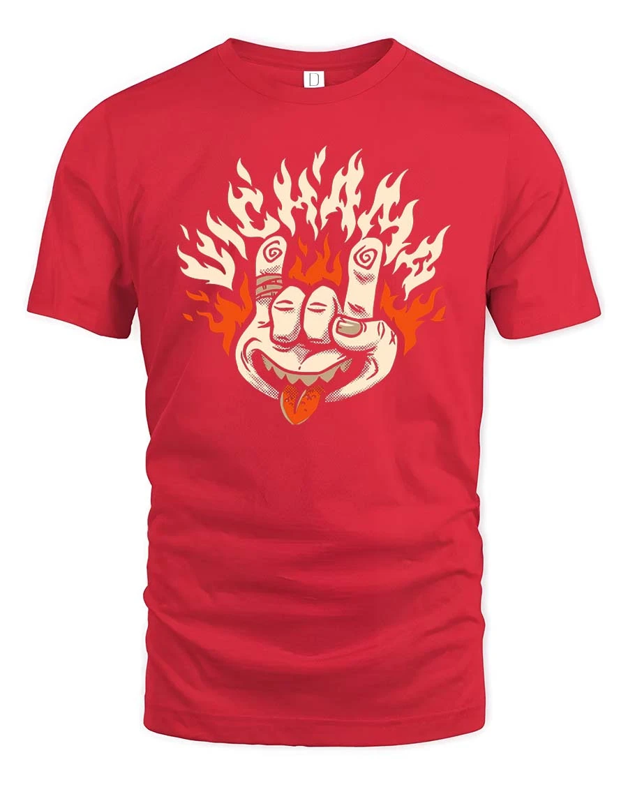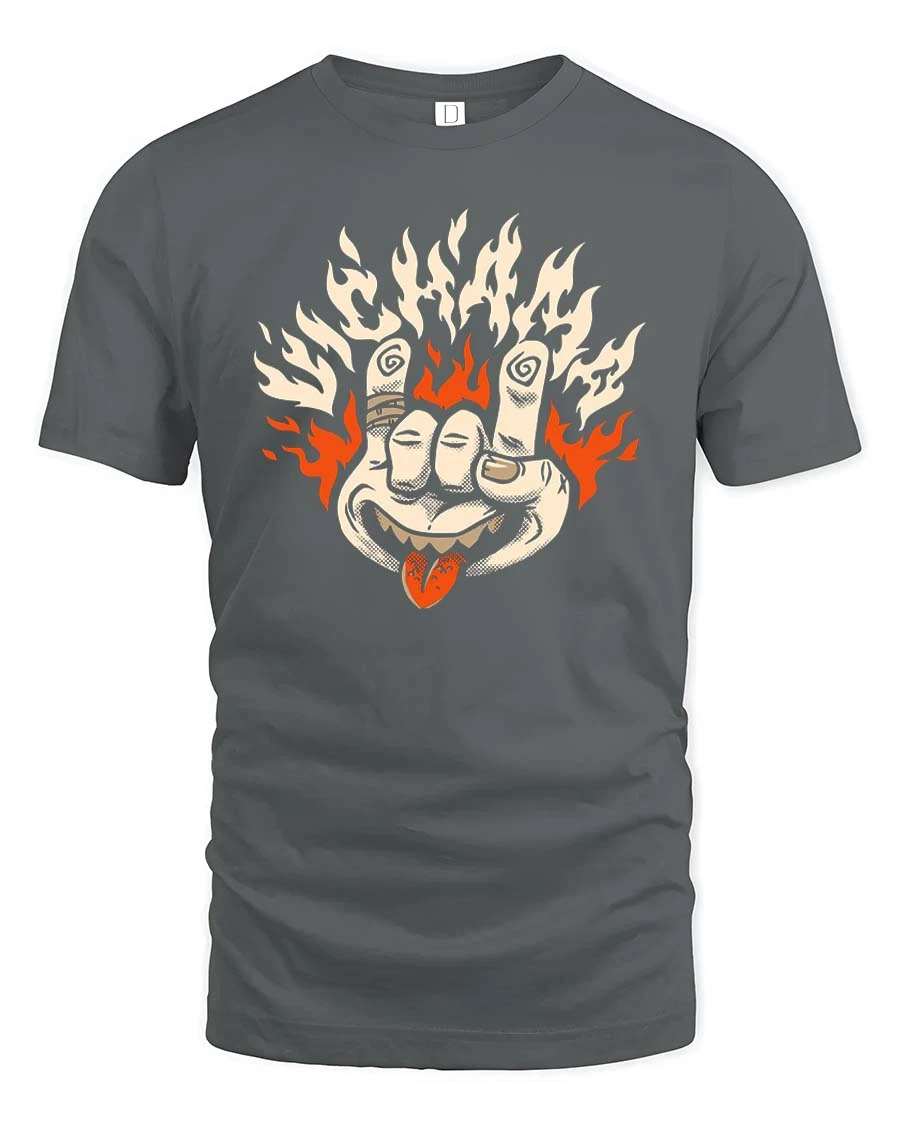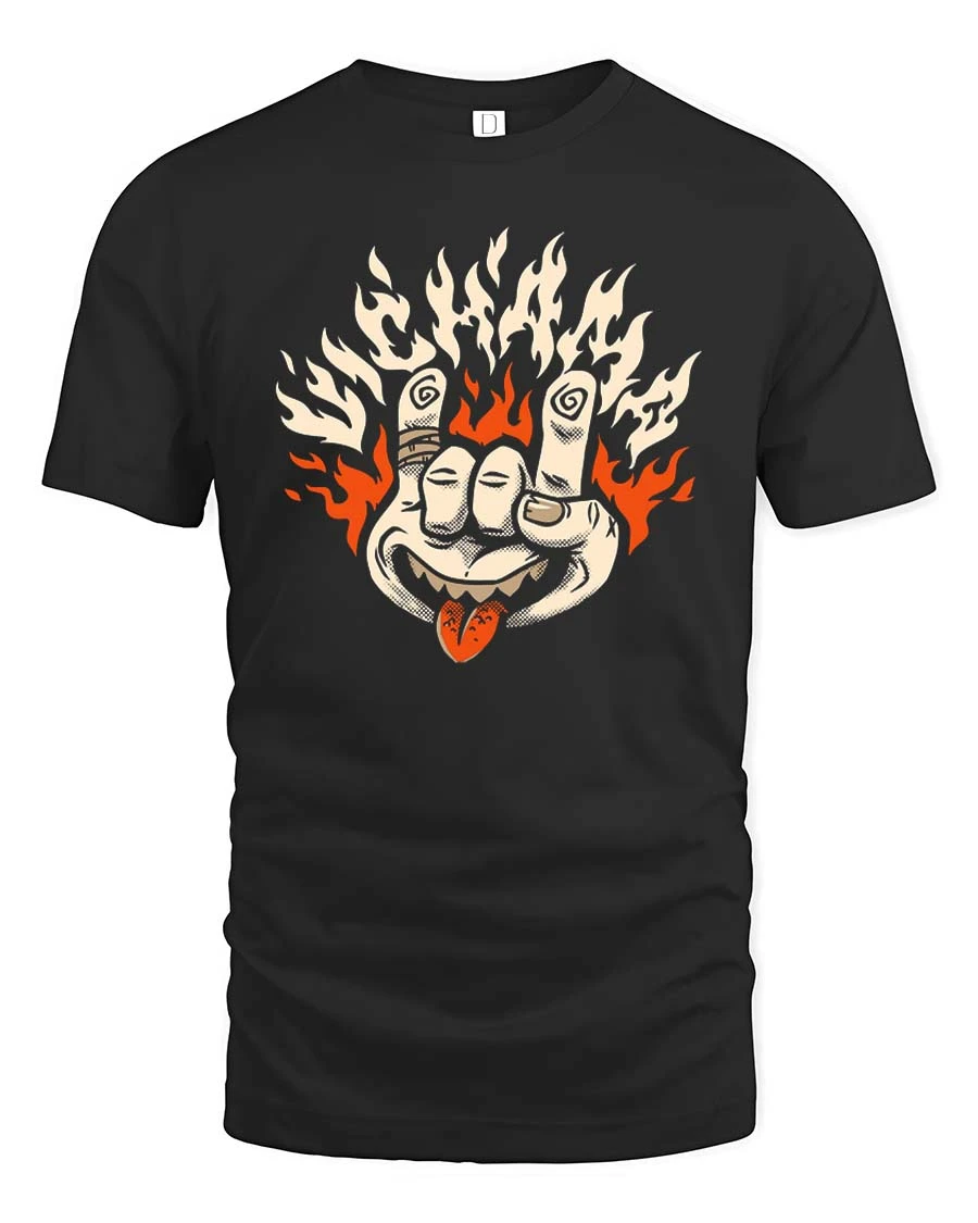 Flame Hand Rock Gesture Retro Edgy Graphic T Shirt features a bold artistic design inspired by expressive rock style symbolism and retro graphic elements.