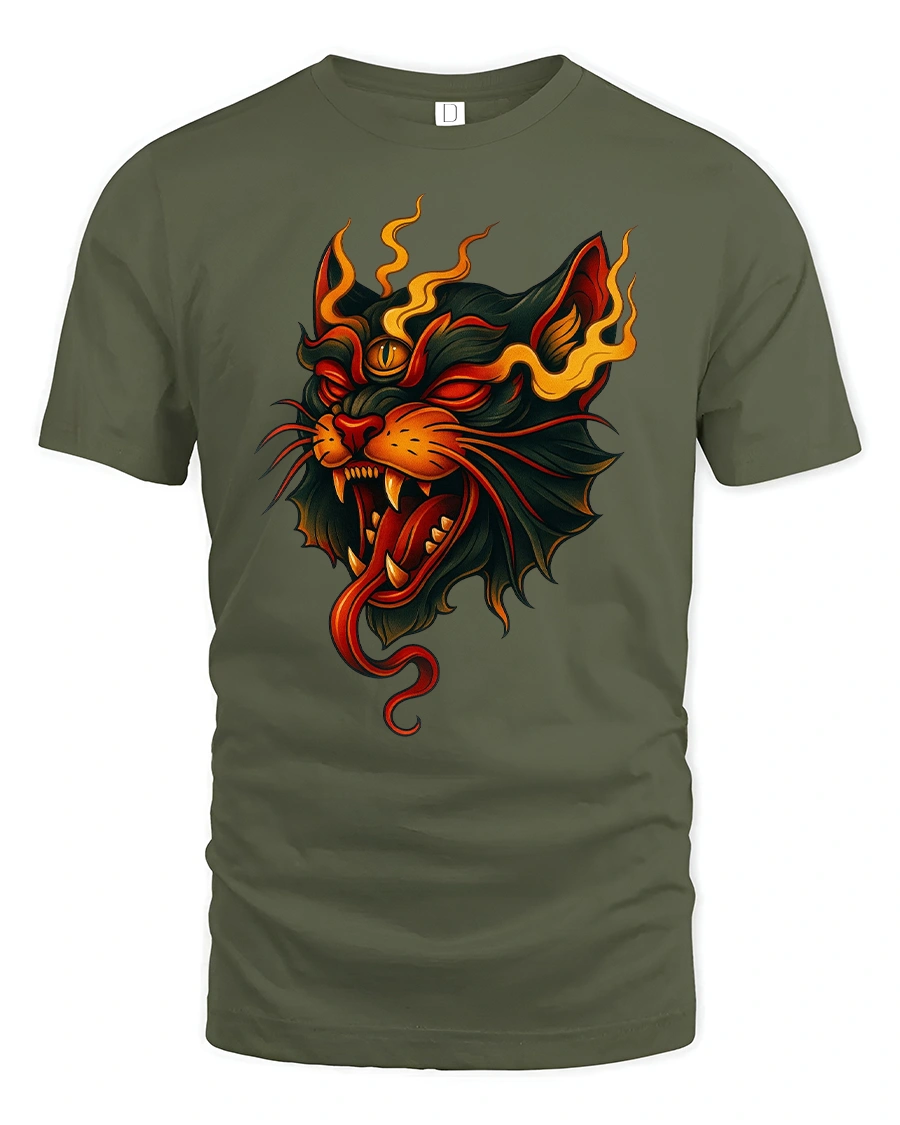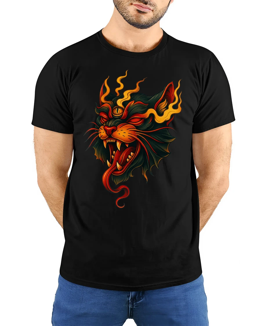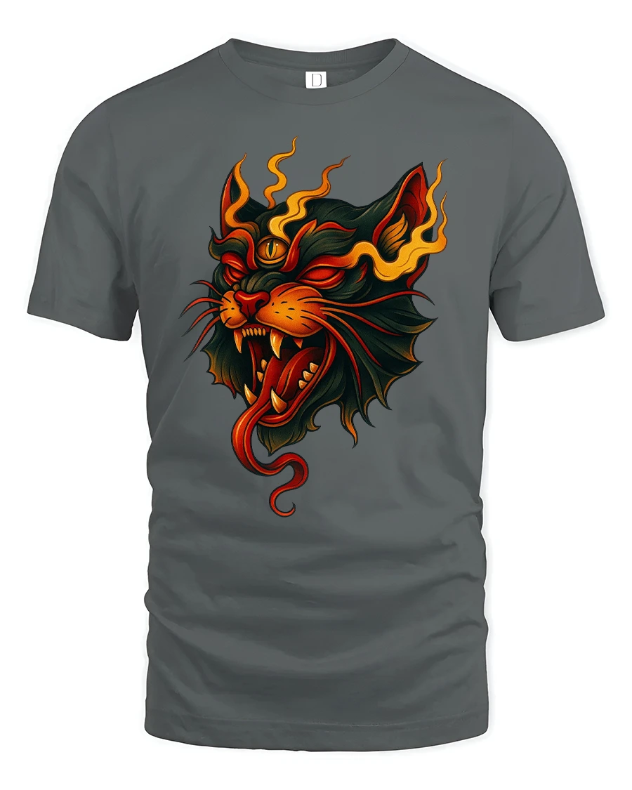 Unleash your wild side with this Flaming Demon Cat Fiery Spirit Graphic T-Shirt, a bold fusion of fire and feline power.