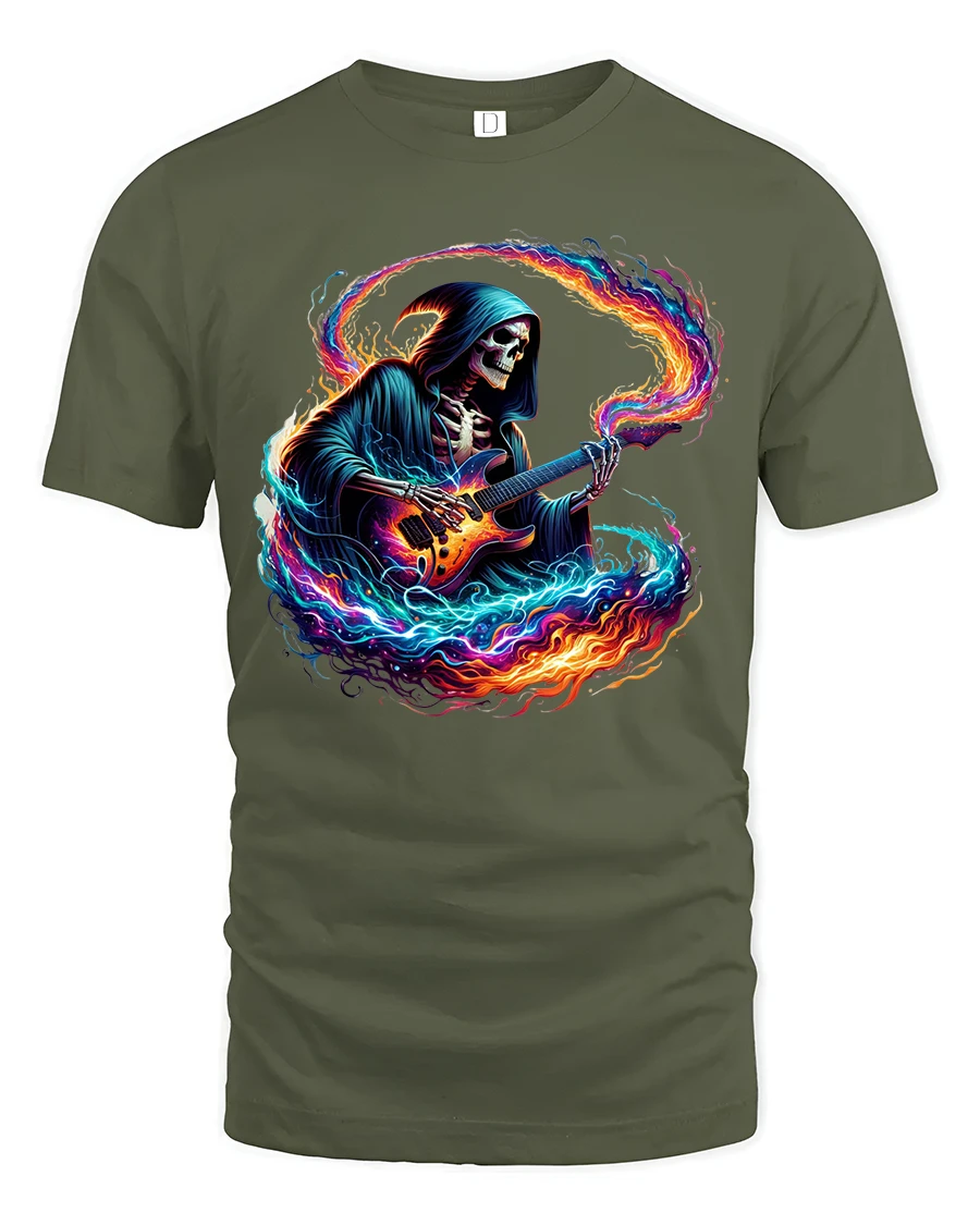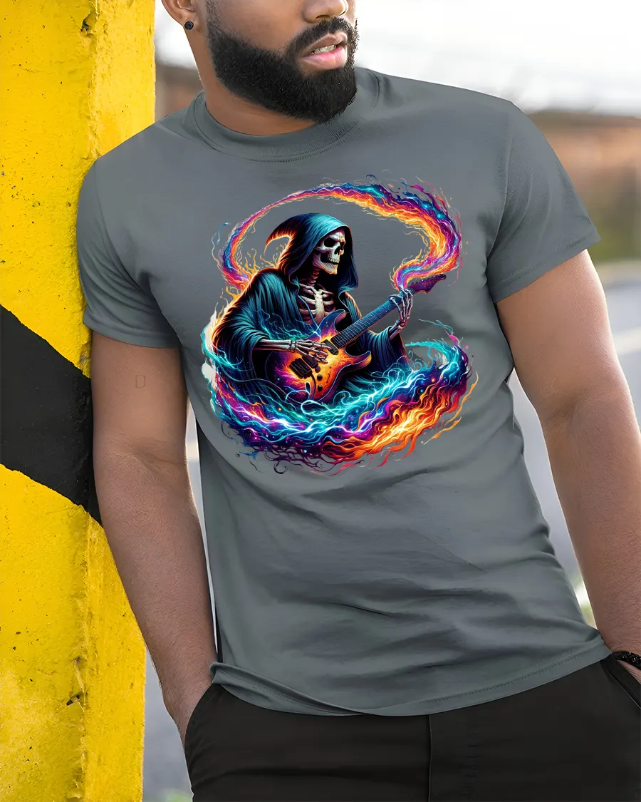 Flaming Guitar Reaper Graphic Tshirt Rock Music Fantasy Art Tee speaks to those who live loud and express themselves through music.