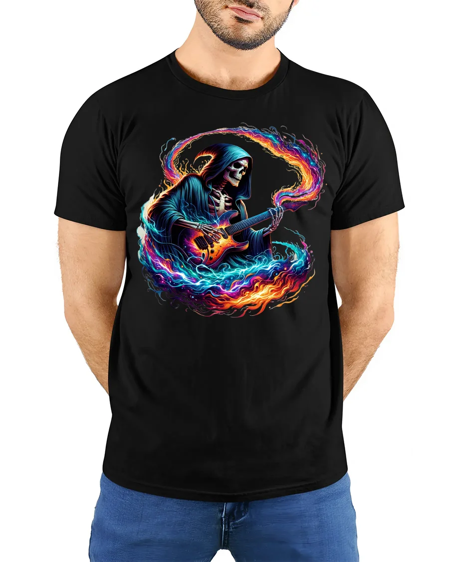 Flaming Guitar Reaper Graphic Tshirt Rock Music Fantasy Art Tee delivers a powerful fusion of music passion and bold fantasy artwork.