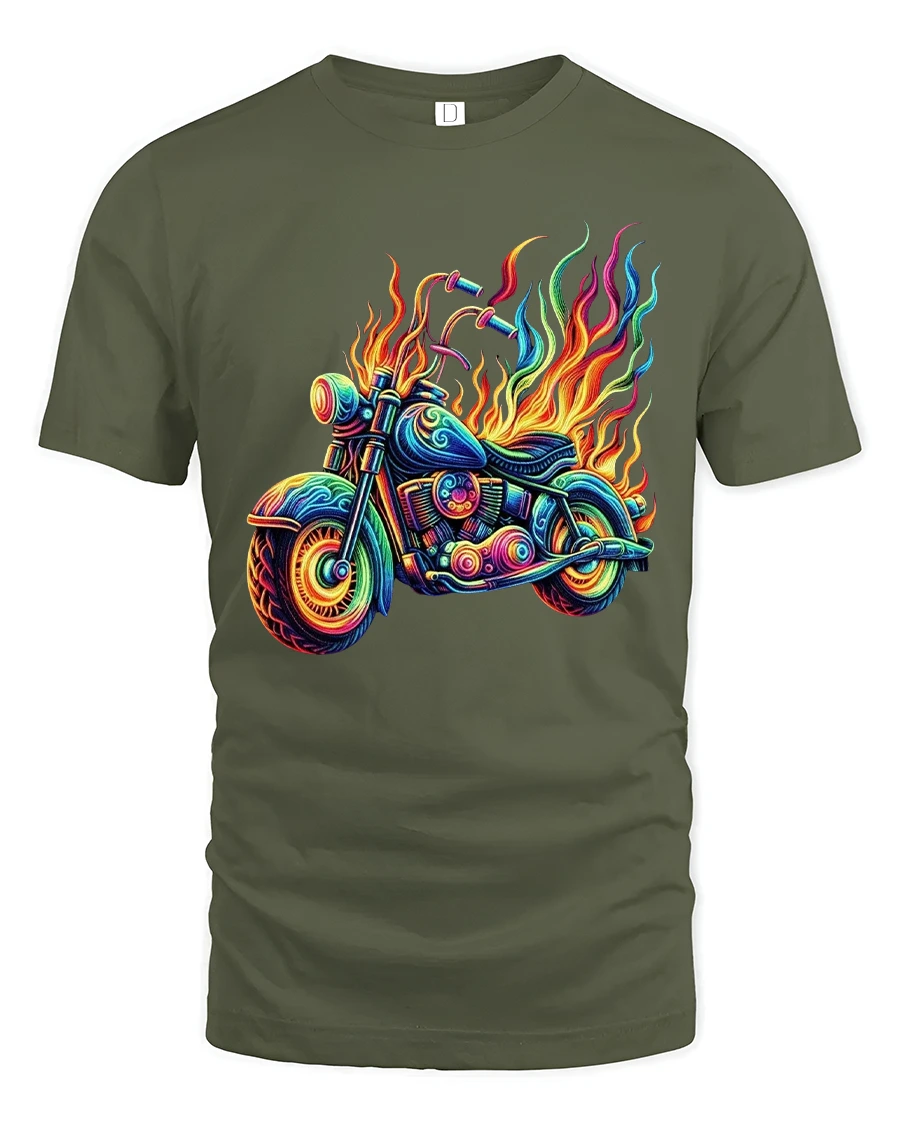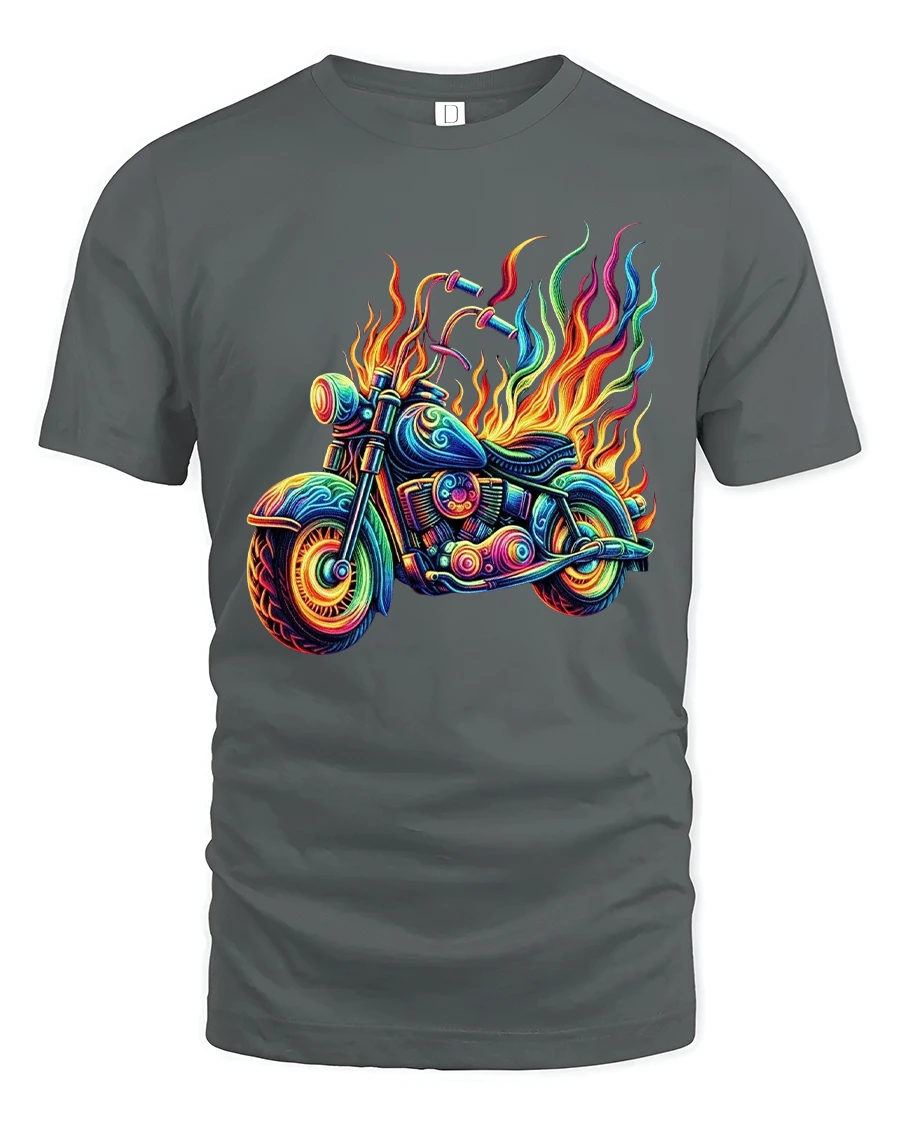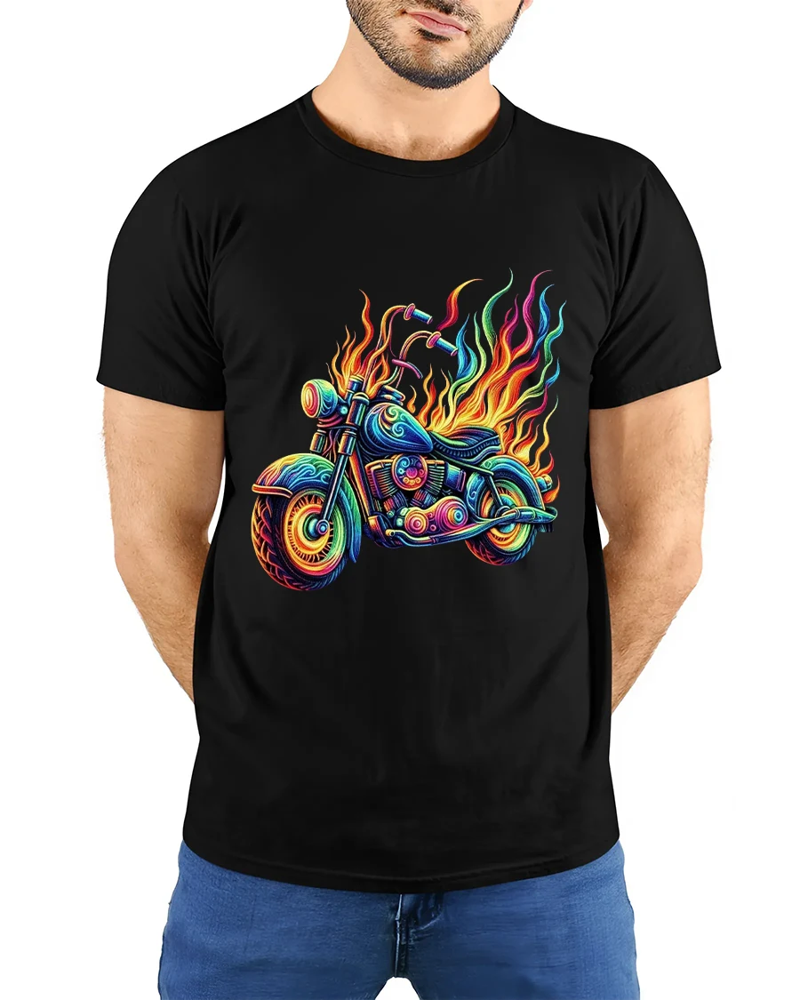 Flaming Neon Motorcycle Graphic Tee With Psychedelic Street Art is perfect for riders bike lovers and fans of bold artistic expression.