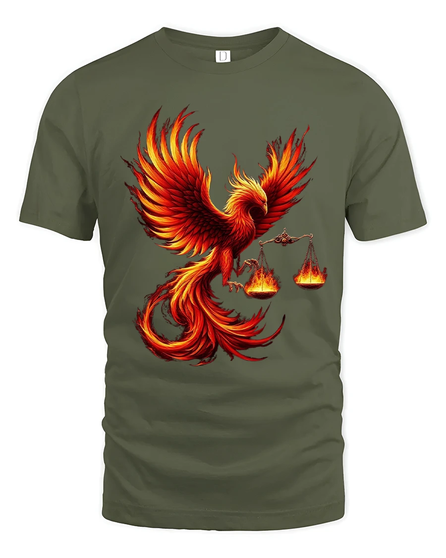 Featuring a blazing phoenix rising with fiery wings while holding scales of balance, this design symbolizes justice transformation and inner power.