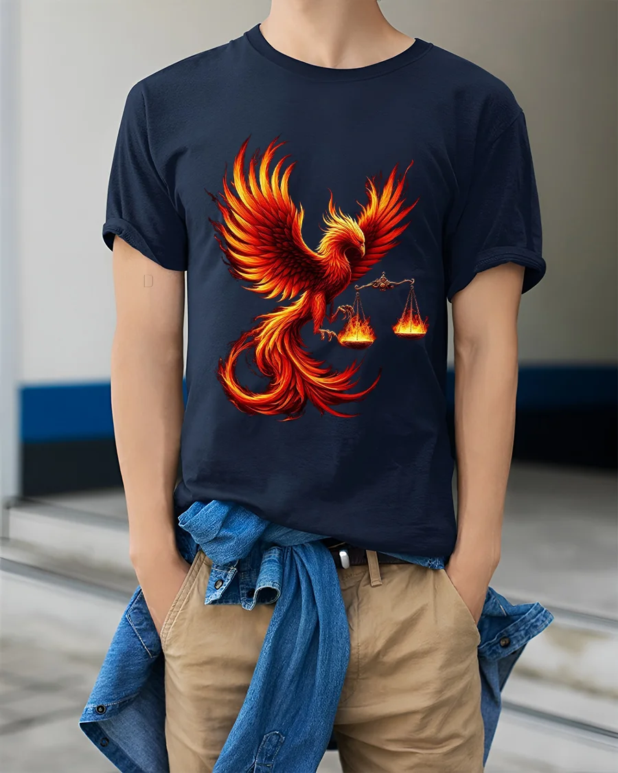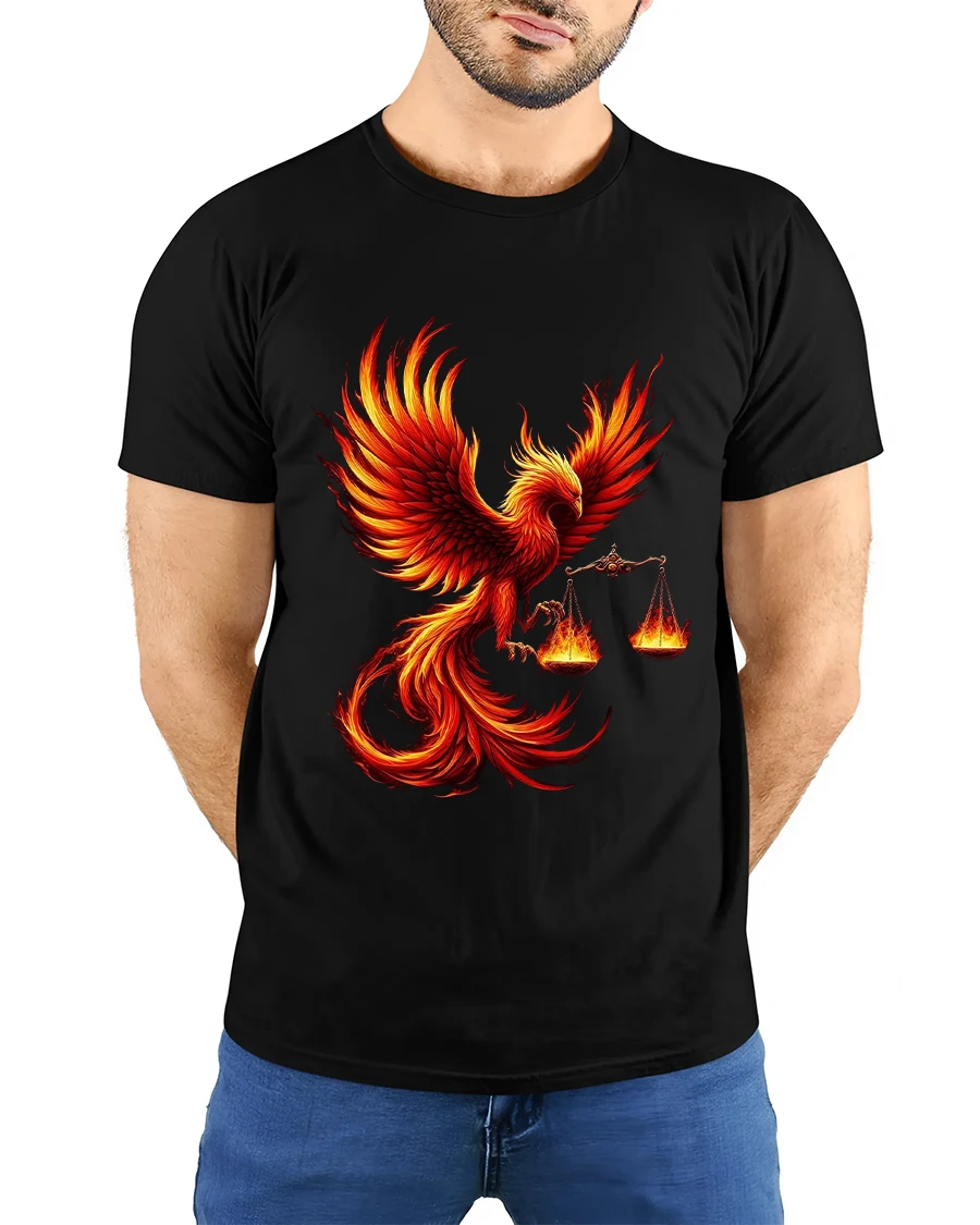 The Flaming Phoenix Balance Art Tee Fire Bird Symbol Graphic TShirt represents rebirth strength and the power of balance through striking visual art.