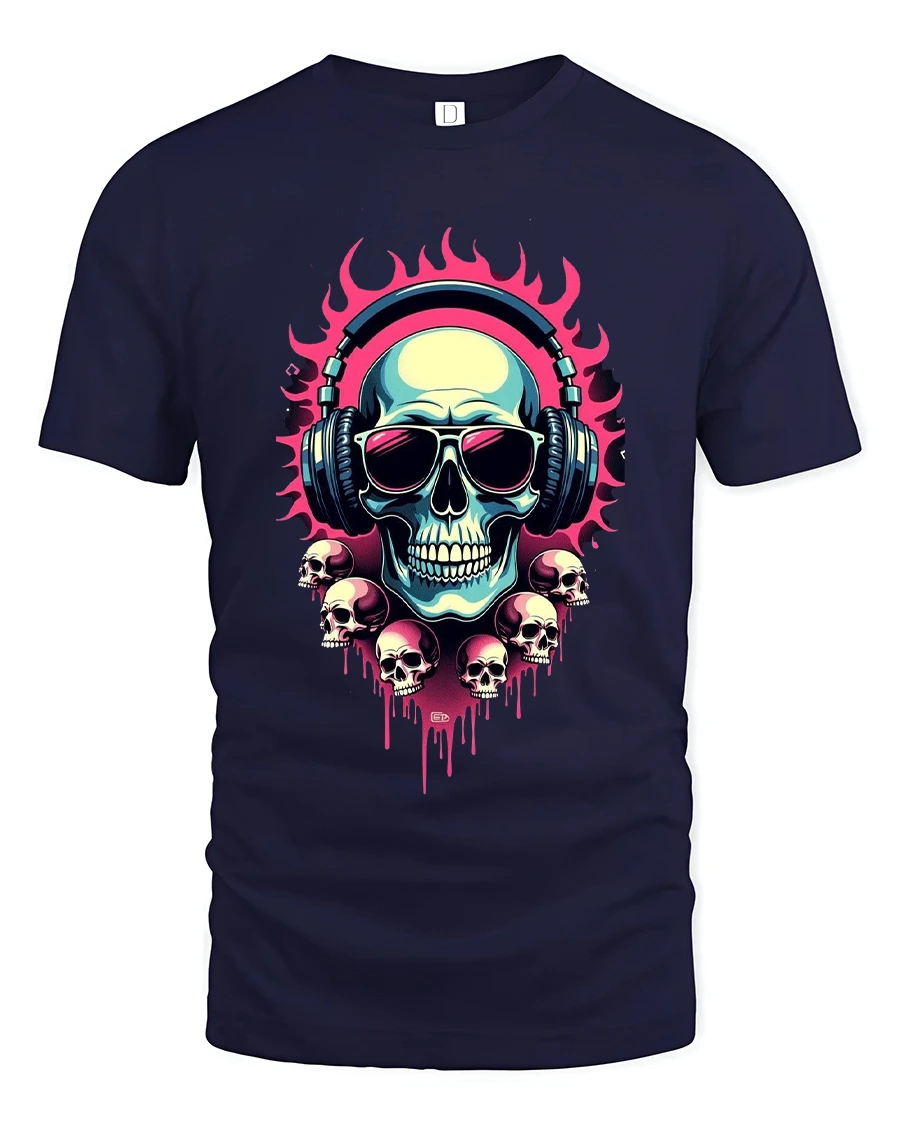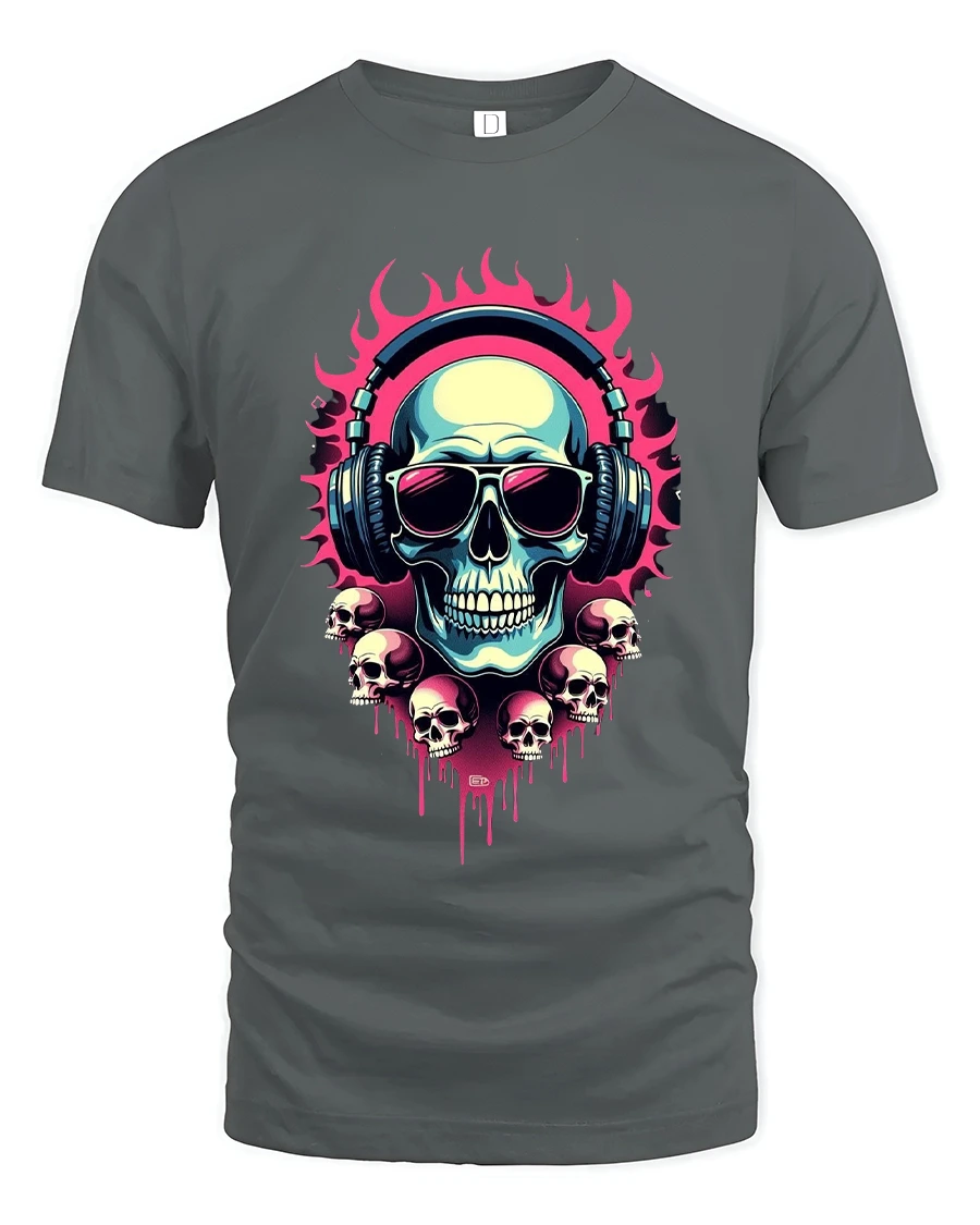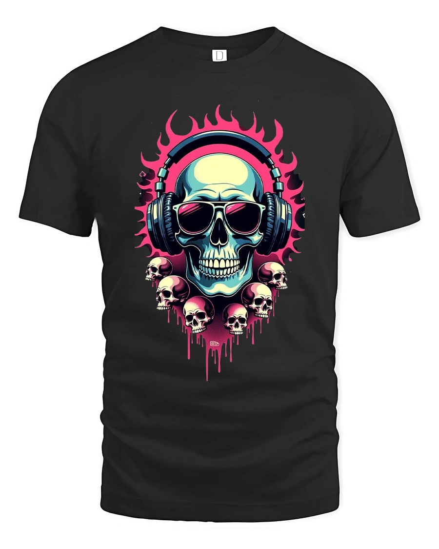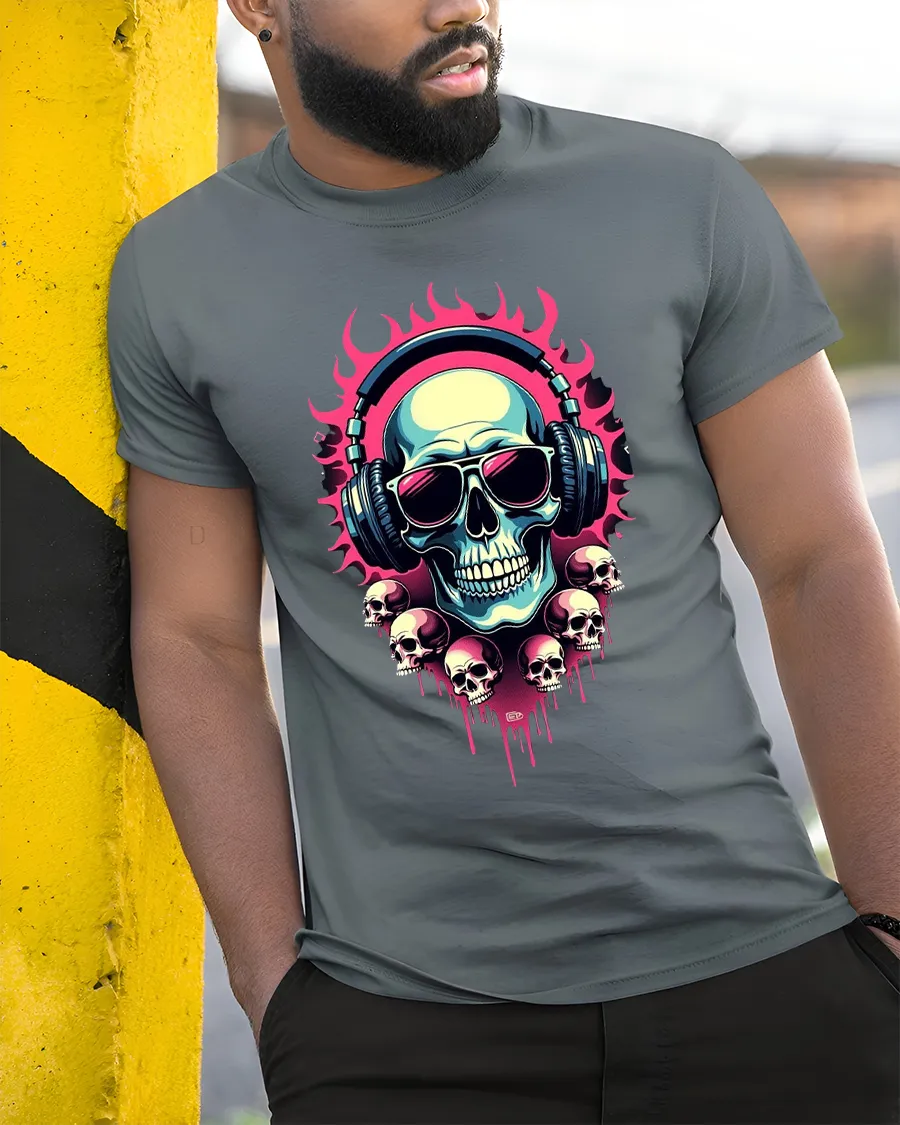 Flaming Skull DJ Headphones Neon Art Graphic Tee Shirt delivers bold attitude inspired by music culture and street art style.