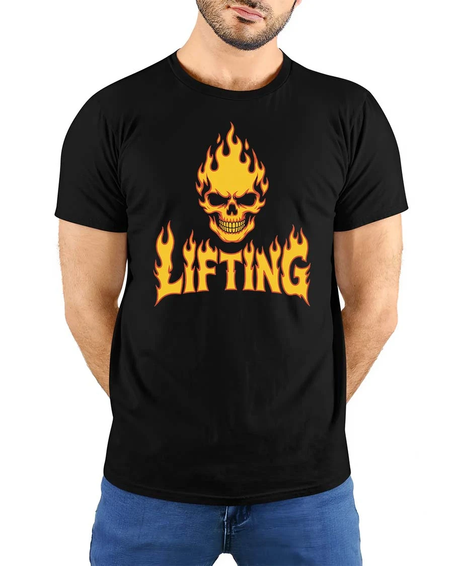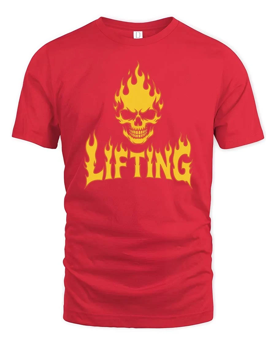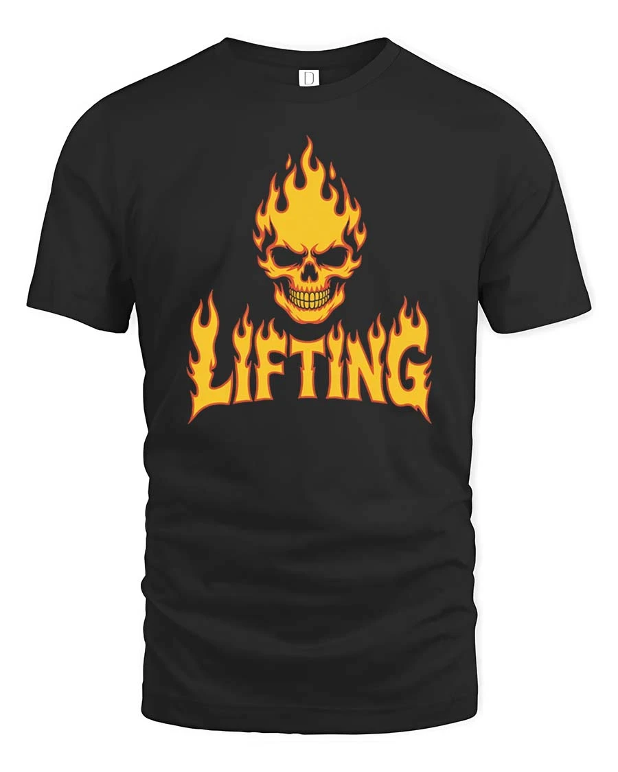 Flaming Skull Lifting Gym Dark Fitness Graphic T-Shirt Tee features a bold fiery design that symbolizes strength determination and unstoppable energy.