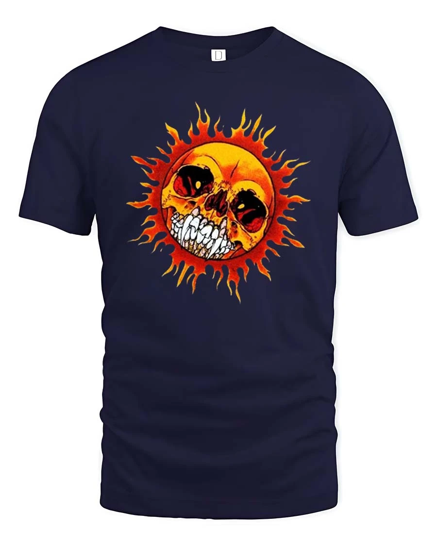 Flaming Skull Sun Graphic T-Shirt is a bold and intense design that blends dark art with fiery energy for a striking visual impact.