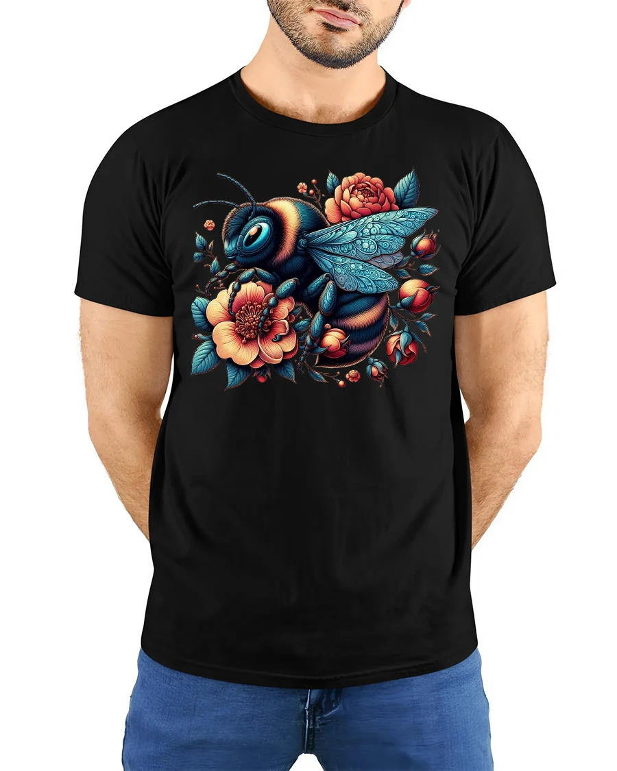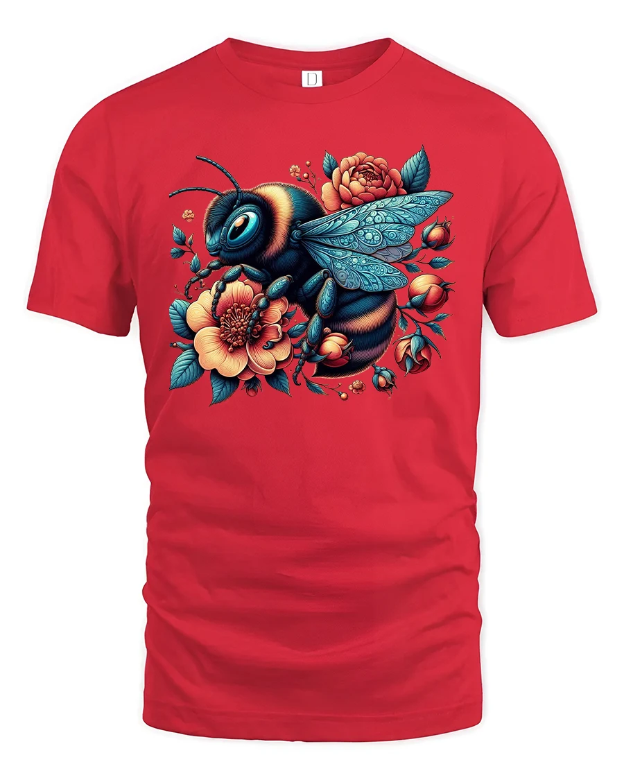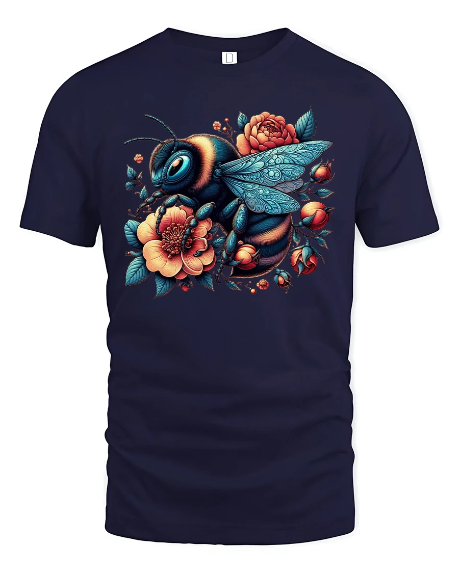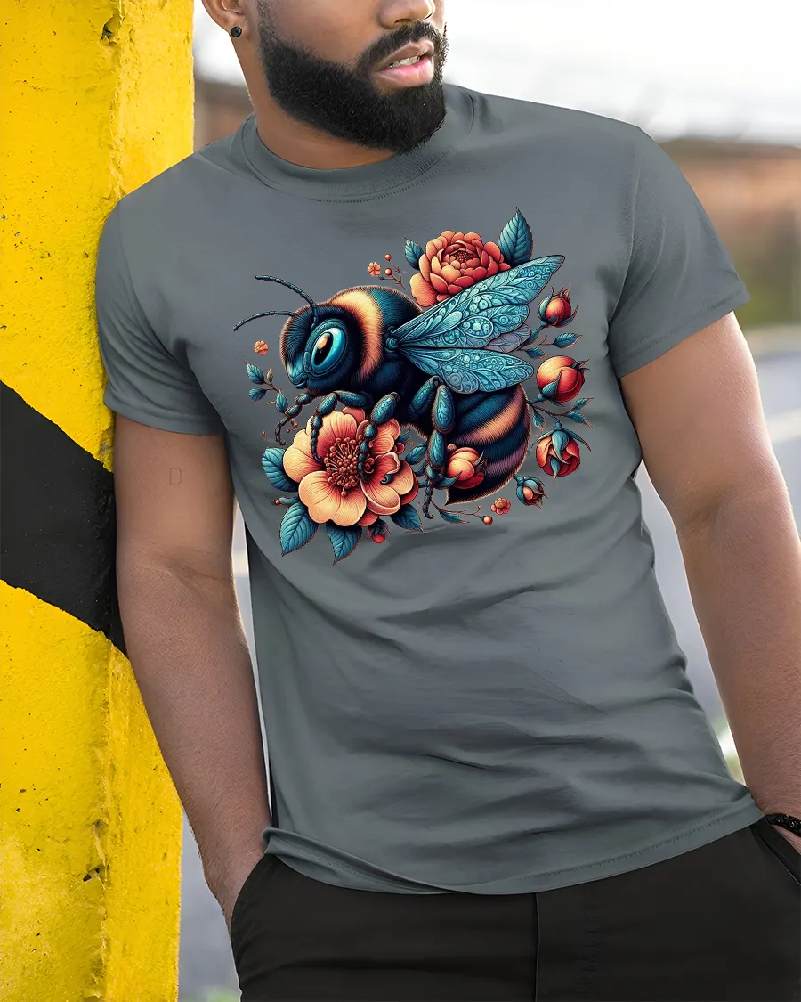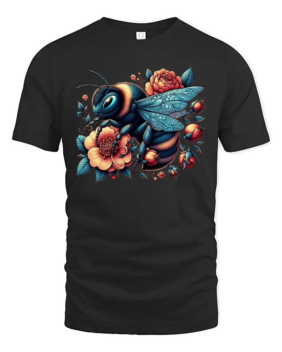 Bring the buzz of creativity and beauty to your wardrobe with this artistic bee and flower t-shirt — a perfect blend of nature, color, and charm.