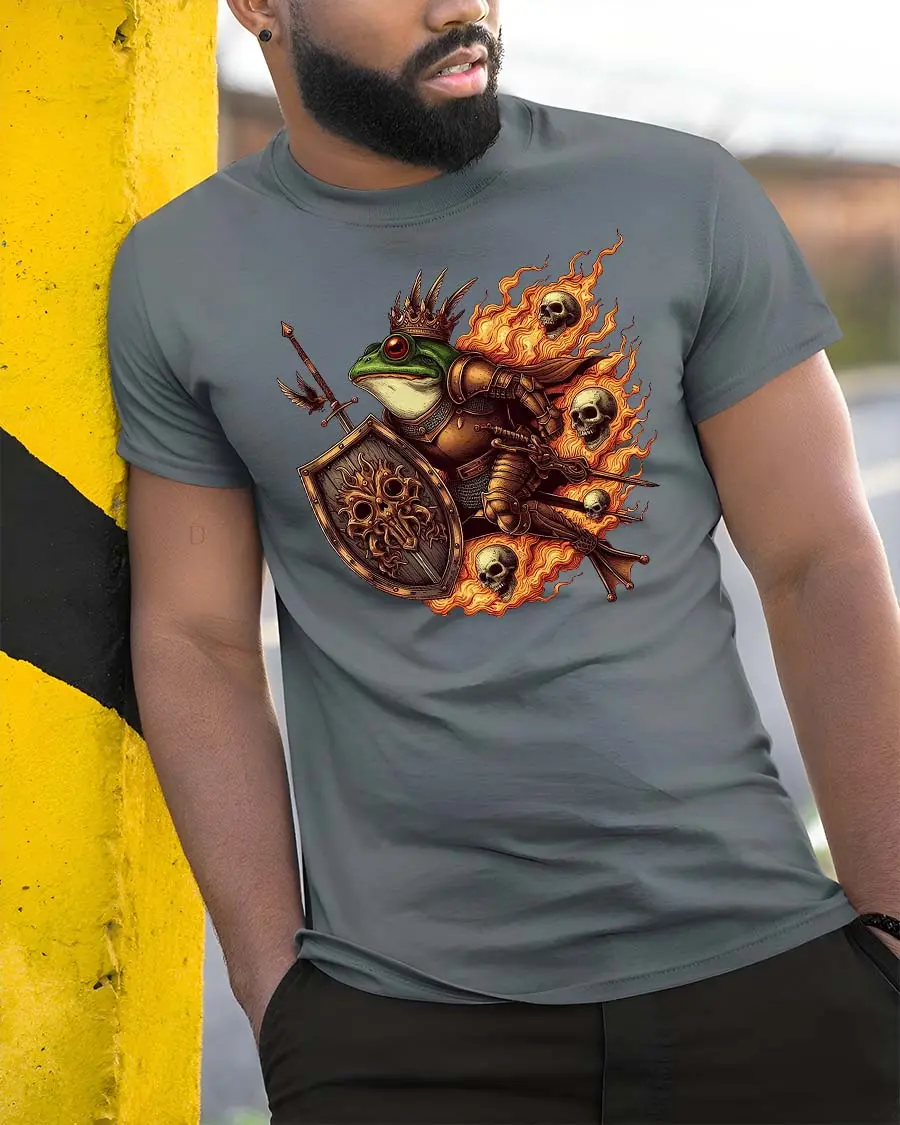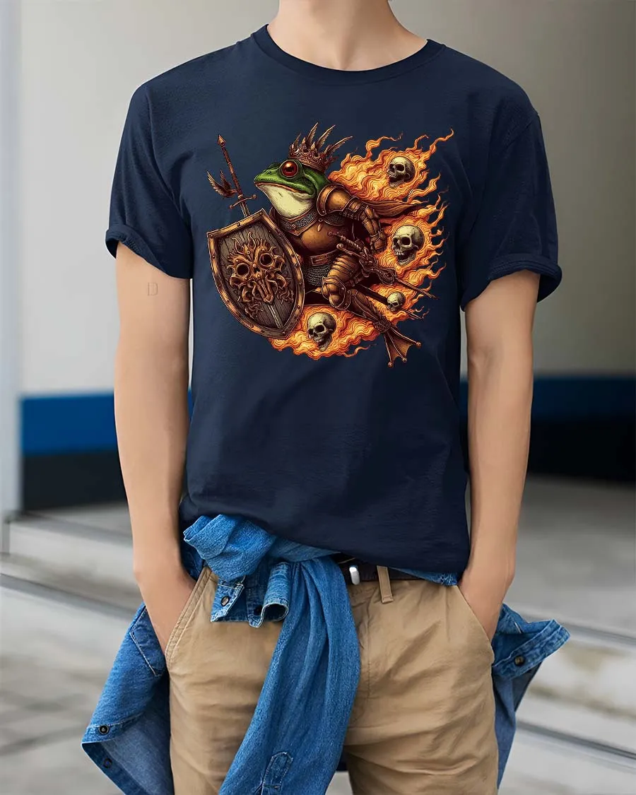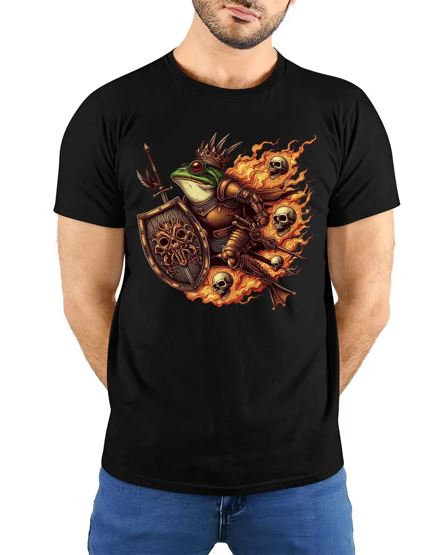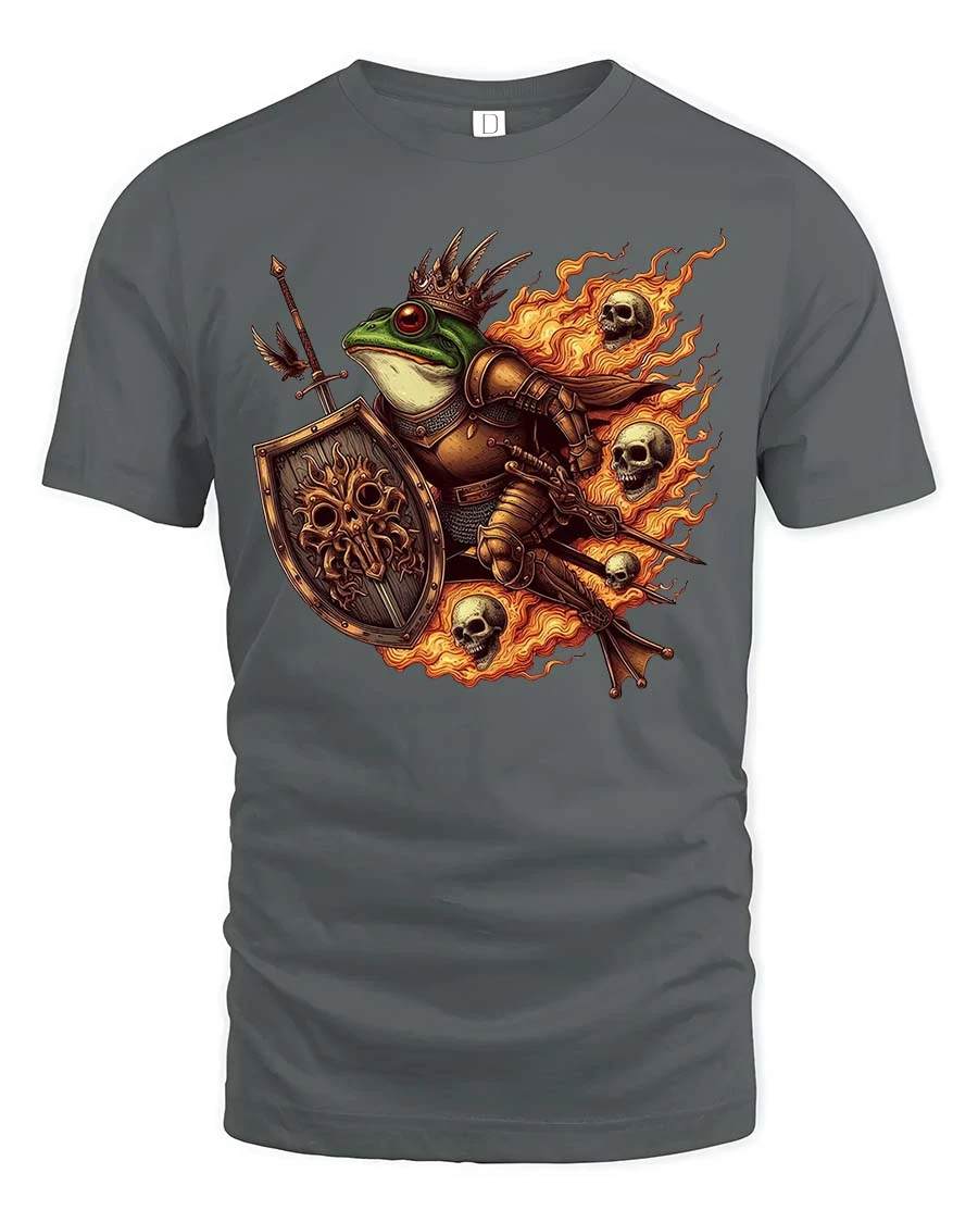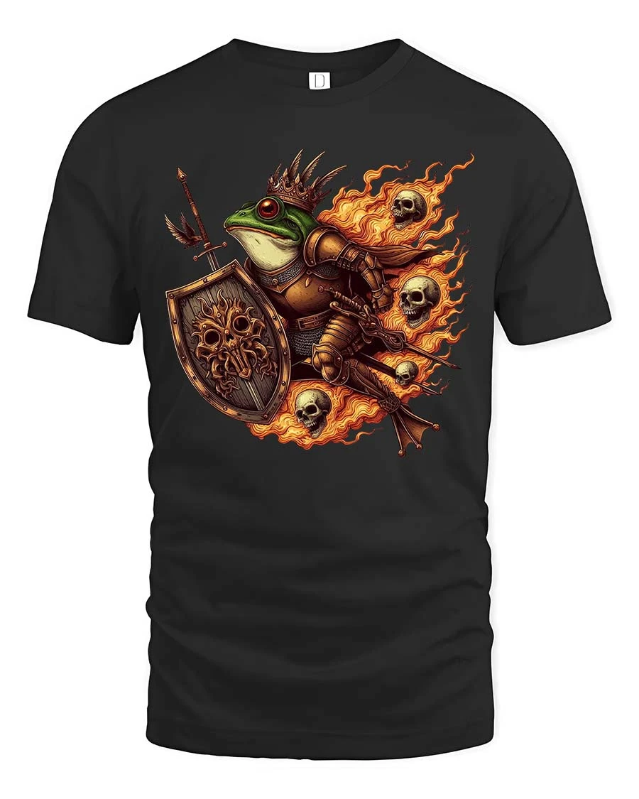 Featuring a heroic frog dressed as a knight surrounded by fiery skulls, this t-shirt creates a striking and epic visual.