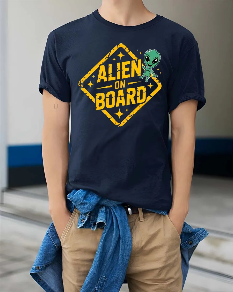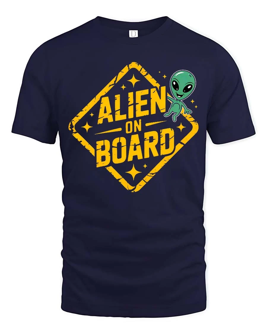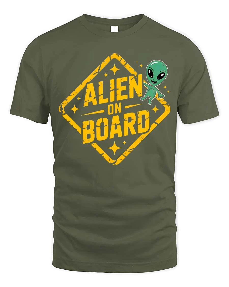 Funny Alien On Board Road Sign Graphic t-shirt Gift Idea brings playful sci fi humor into everyday fashion.