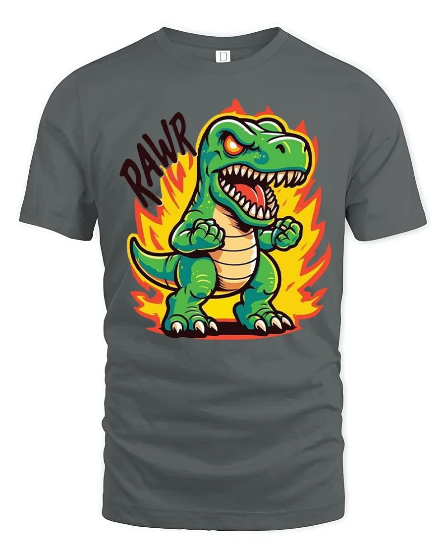 The Funny Angry Dinosaur Cartoon Graphic Tshirt With Roaring Fire Art is perfect for anyone who enjoys cute yet bold animal illustrations.