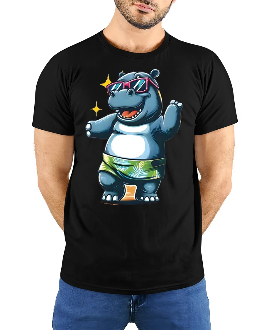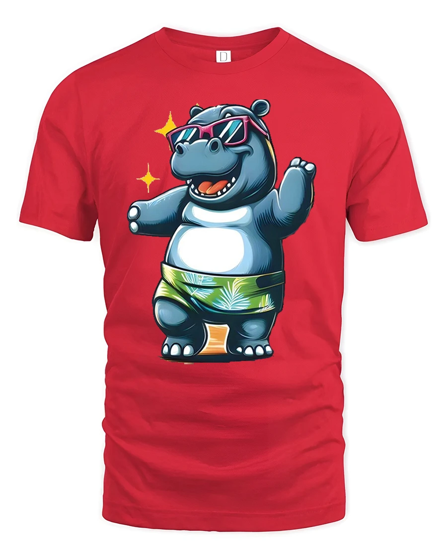 Featuring a cheerful hippo rocking pink shades and tropical shorts, this shirt captures the perfect mix of humor, style, and carefree vacation energy.