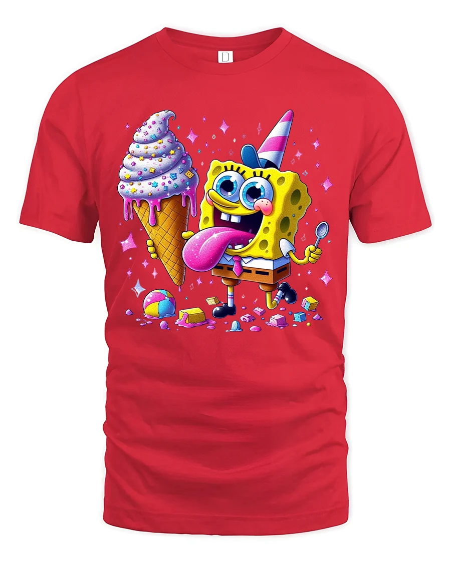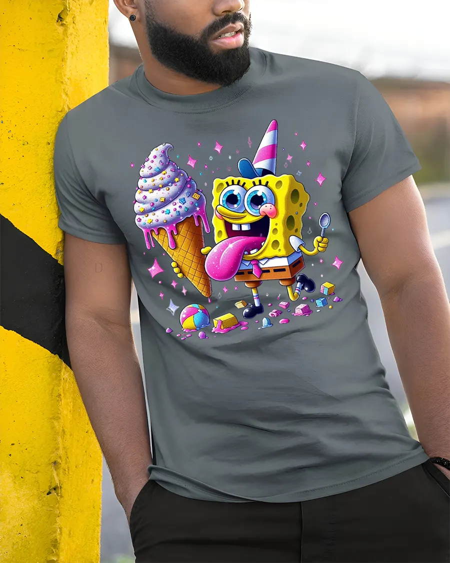Funny Cartoon Sponge Ice Cream Party Graphic Tee Shirt brings bright energy and playful imagination into a bold graphic design.