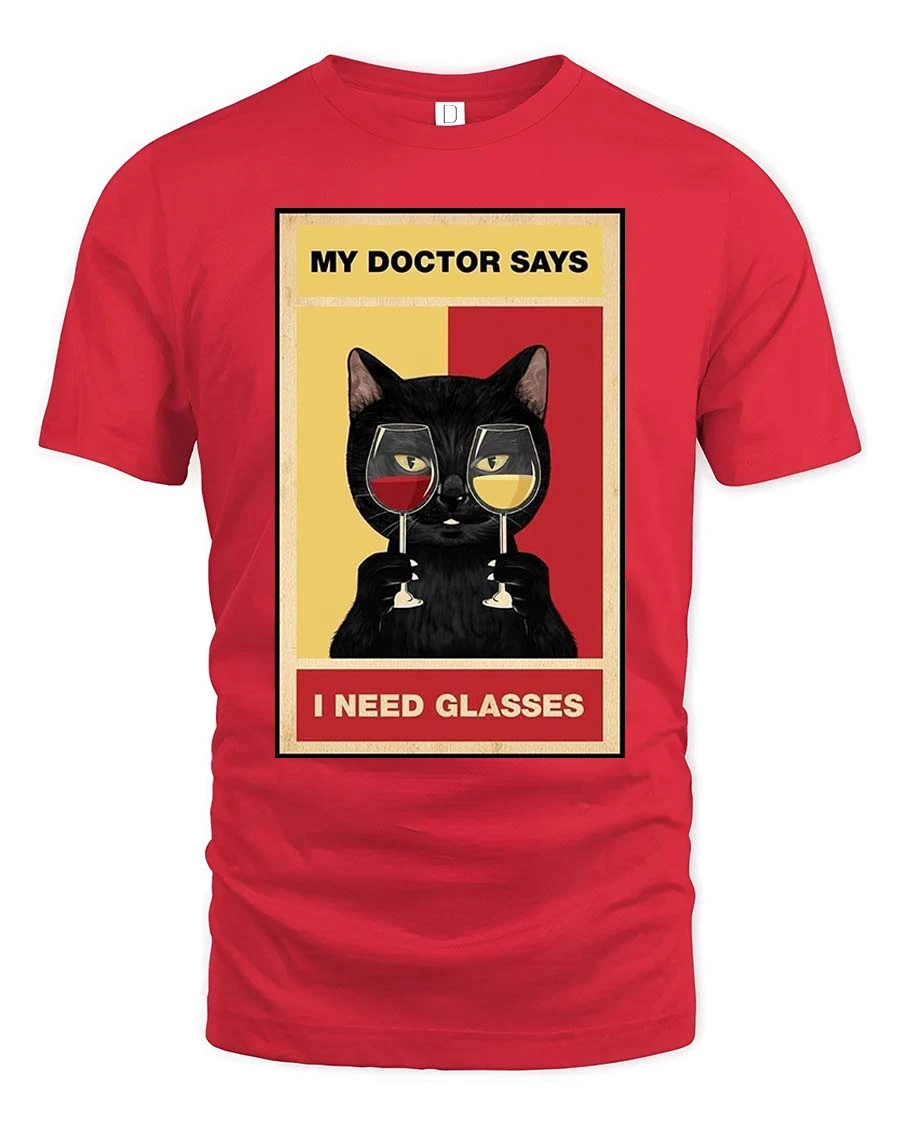 The Funny Cat Wine Glasses Pun Graphic T-Shirt features a clever and humorous design of a cool black cat holding two wine glasses with the playful phrase “My Doctor Says I Need Glasses.” The witty pun and stylish illustration create a fun combination of cat humor and wine lover attitude.