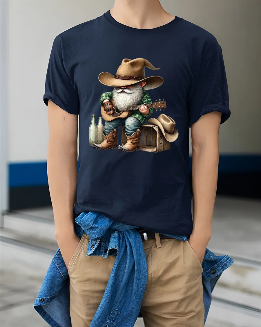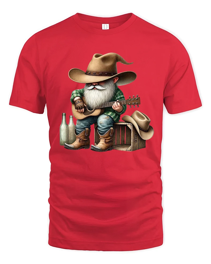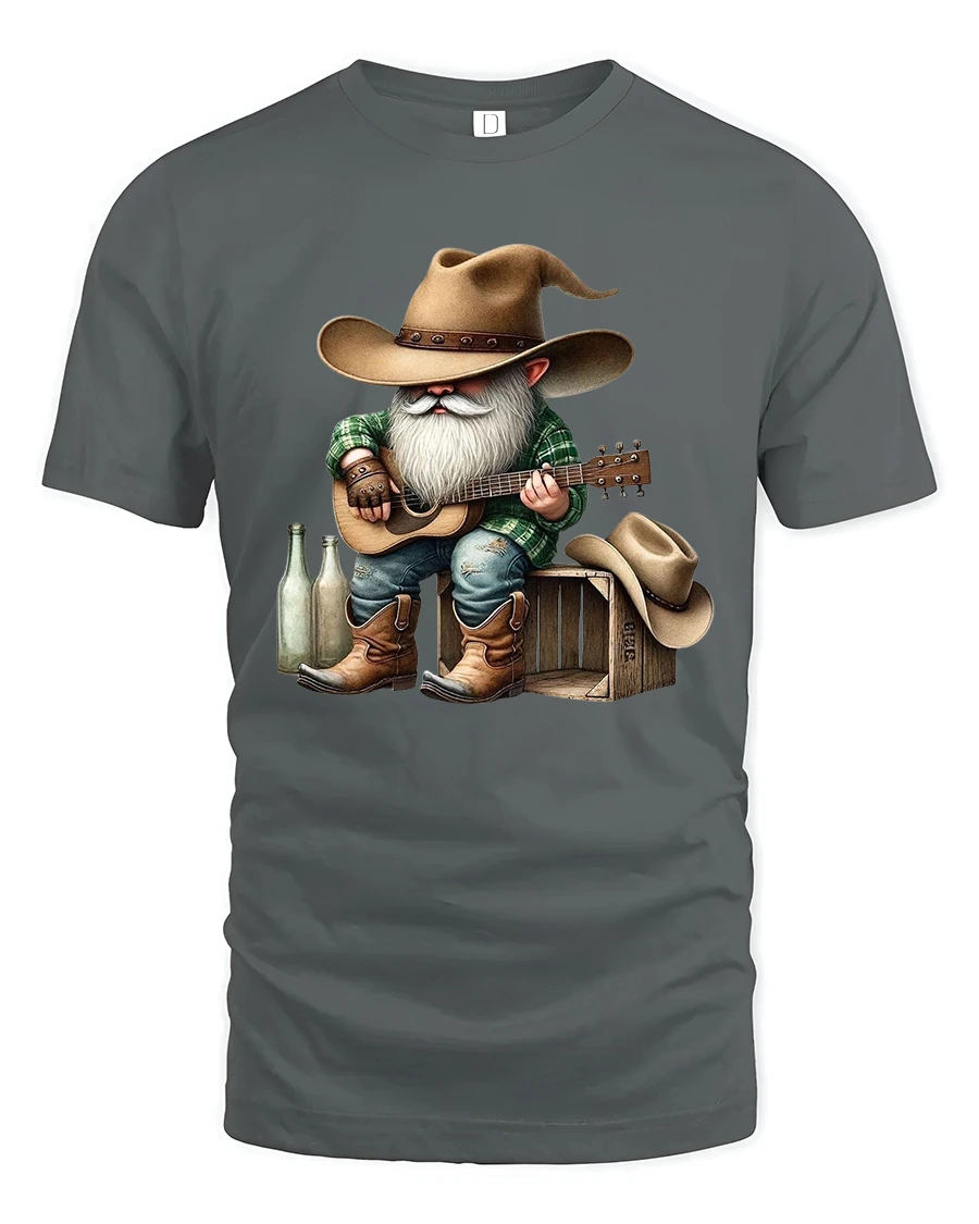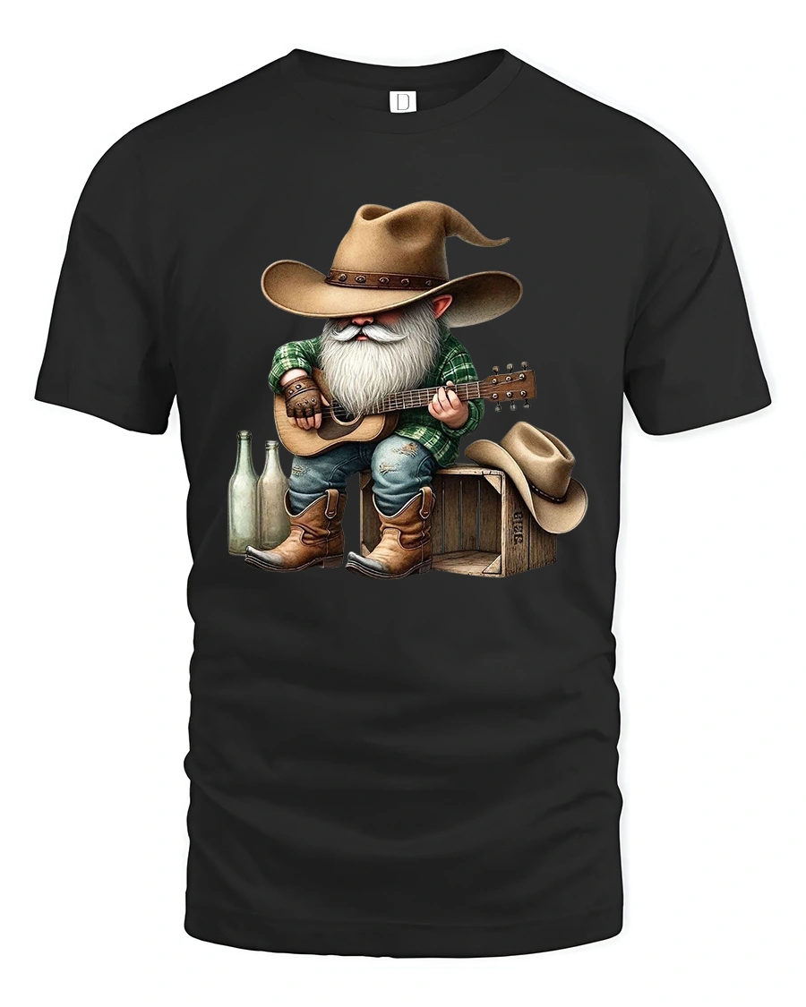 The Funny Cowboy Gnome Playing Guitar Country Music Graphic T Shirt brings humor and rustic charm together in one unique design.