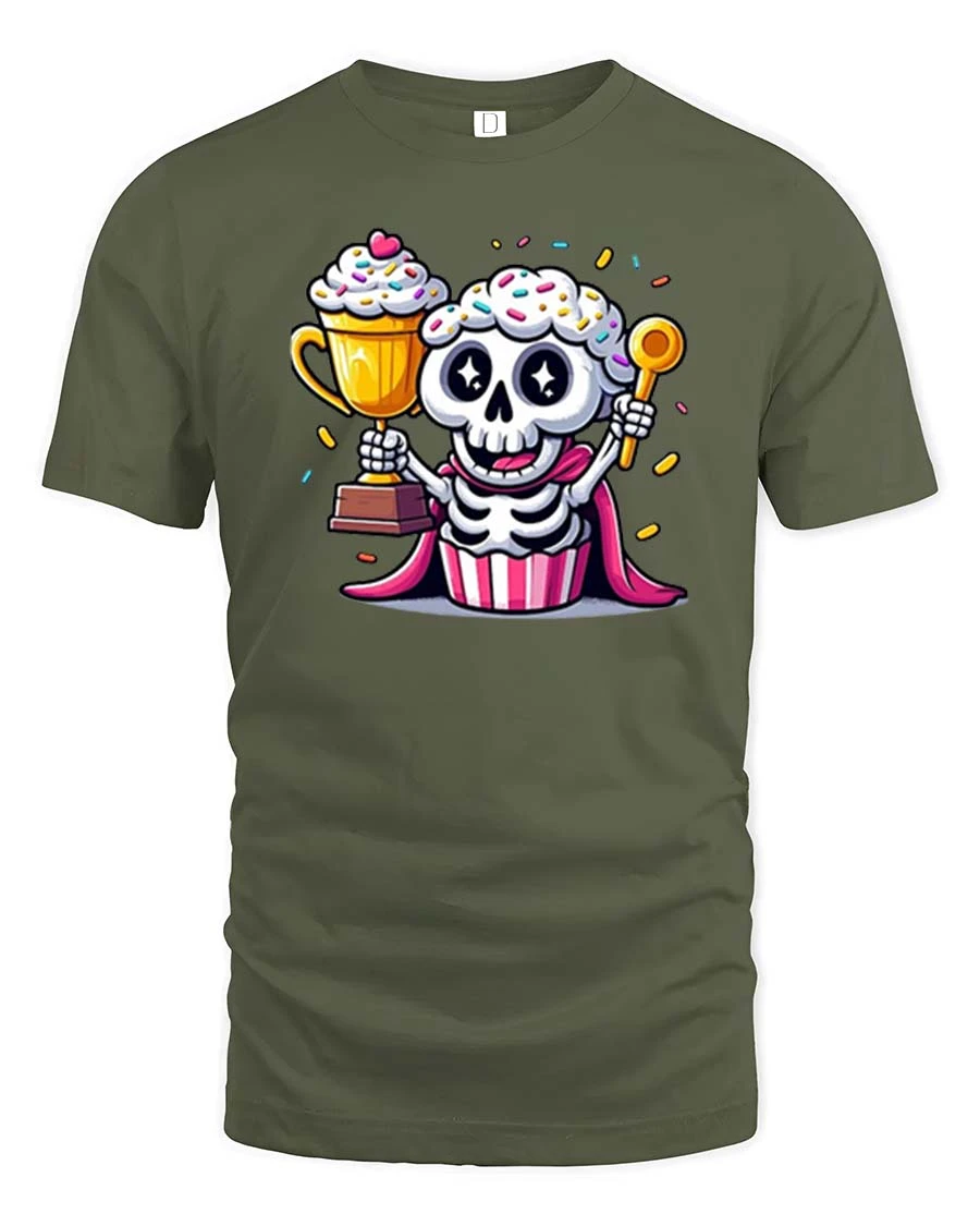 Funny Cupcake Skeleton T-Shirt Cute Sweet Graphic Style Tee blends adorable character design with playful dessert inspired creativity.