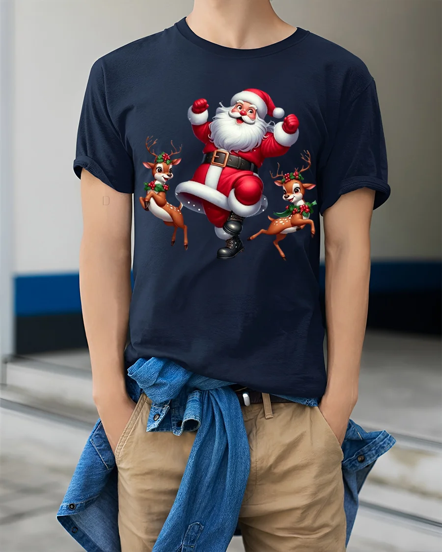 Funny Dancing Santa Claus Cartoon Tee With Playful Reindeer Vibes pairs perfectly with jeans joggers or casual holiday outfits.