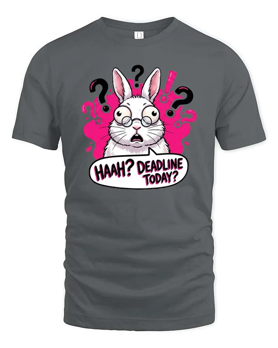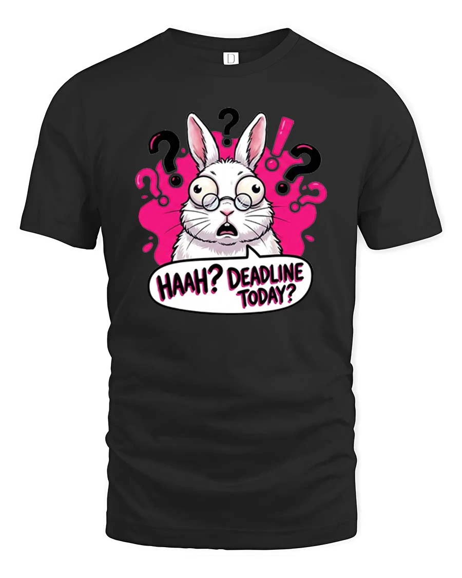 Funny Deadline Today Confused Bunny Humor Work Stress Tshirt features a playful design that captures the relatable surprise feeling when deadlines appear unexpectedly.