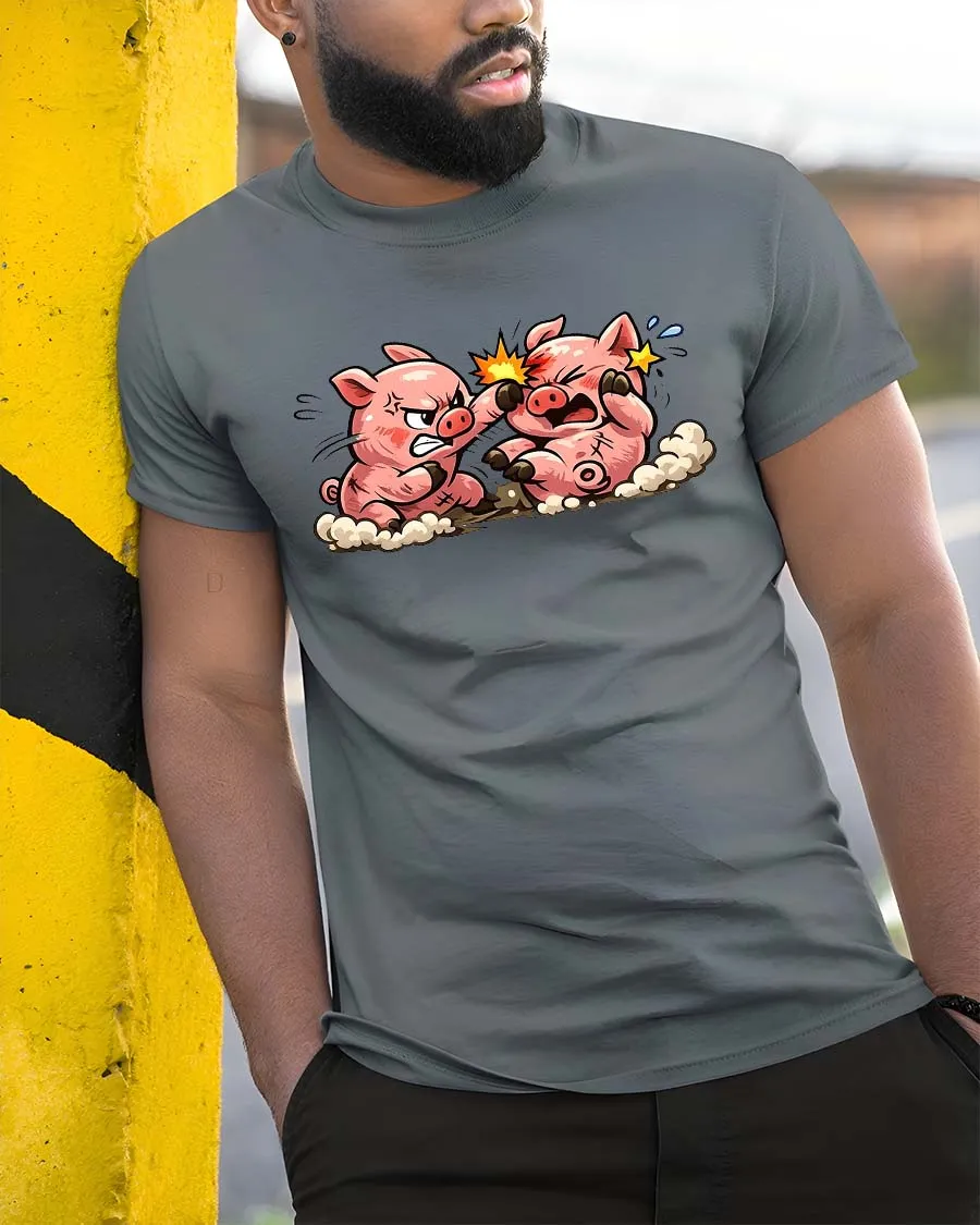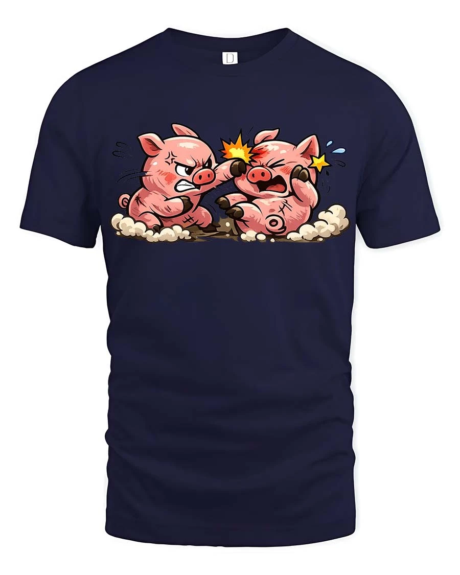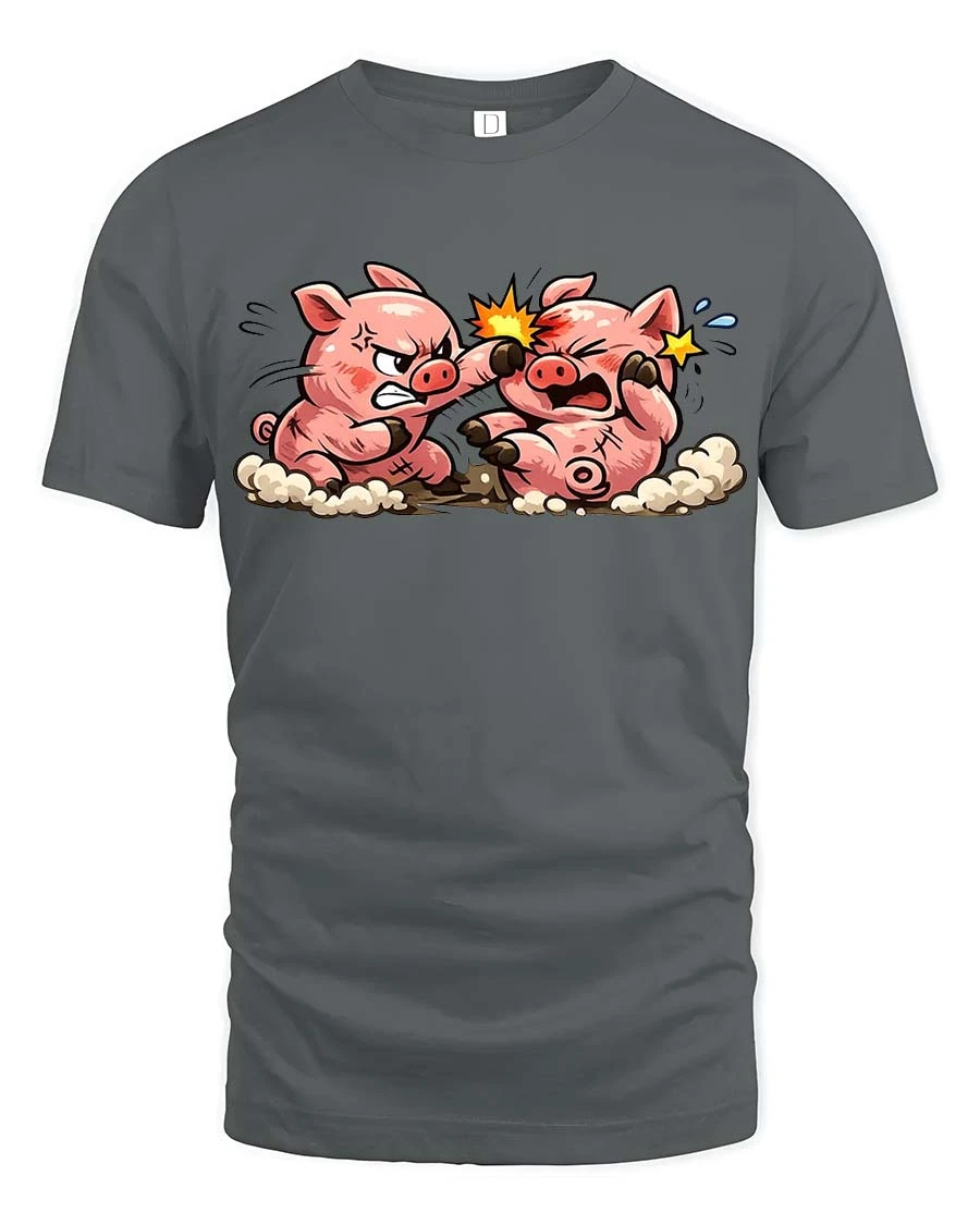 Made with a comfortable cotton feel and a relaxed classic fit, this t-shirt is designed for easy everyday wear. The colorful cartoon pig illustration pops against the dark background, highlighting the playful fight scene and adding personality to your outfit. Whether you’re hanging out with friends, visiting a farm fair, or simply enjoying funny graphic tees, this shirt brings a cheerful and humorous vibe to casual fashion.