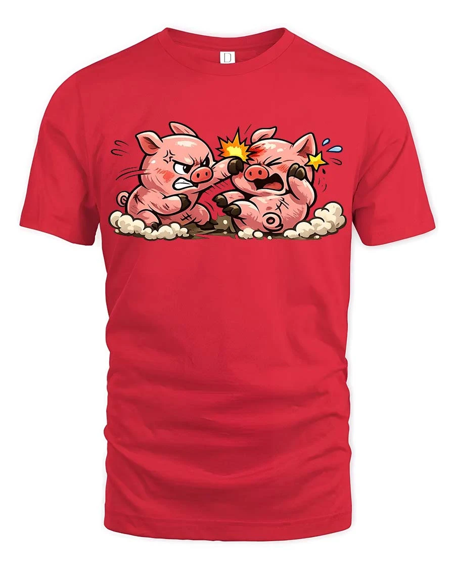 The Funny Fighting Pigs Cartoon T-Shirt features a hilarious comic-style illustration of two feisty pigs caught in a playful showdown. The expressive characters and exaggerated cartoon action create a fun, energetic design that instantly grabs attention. With its humorous farm animal theme and lively artwork, this graphic t-shirt is perfect for anyone who enjoys lighthearted humor and quirky animal designs.
