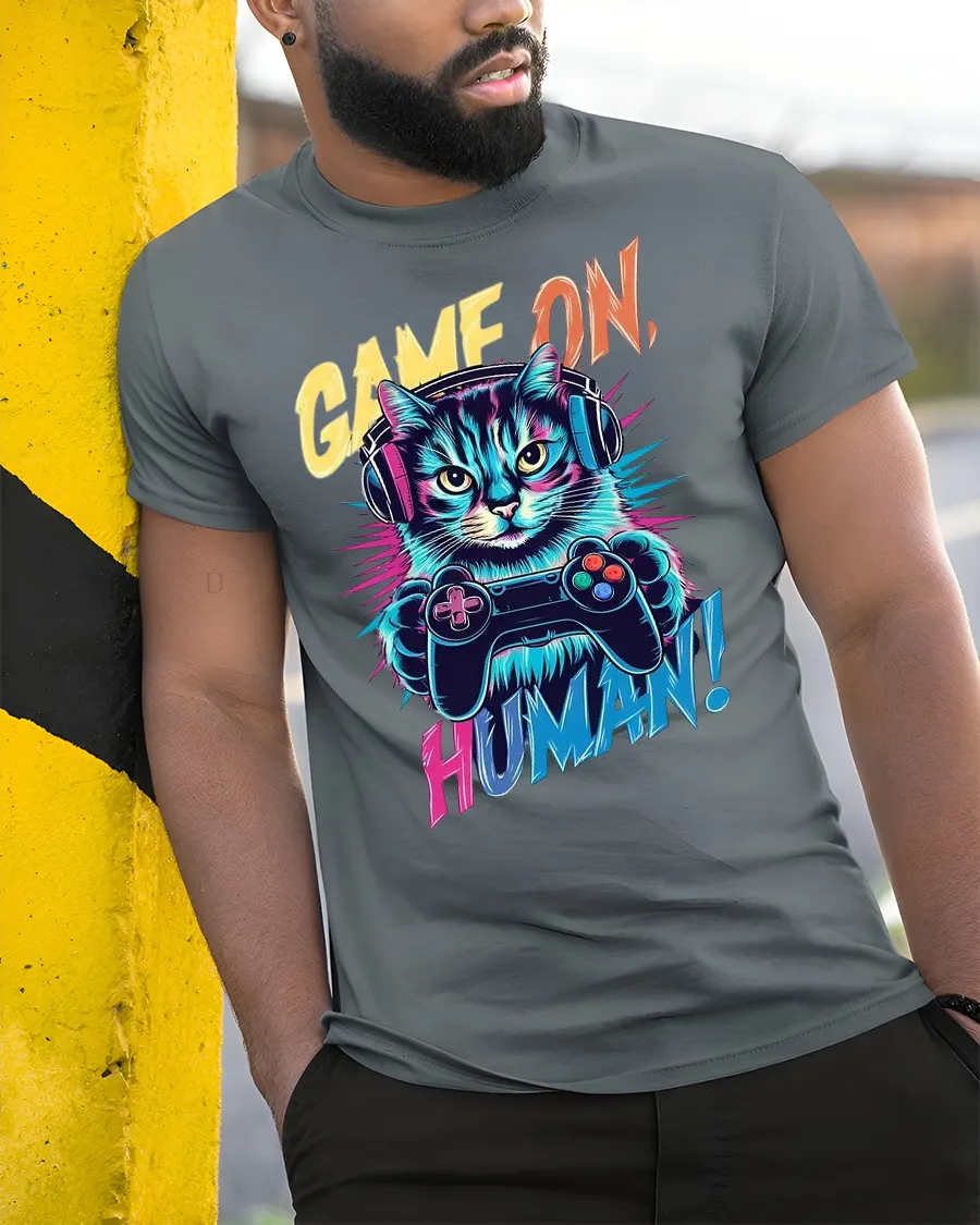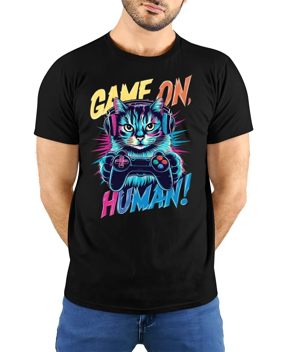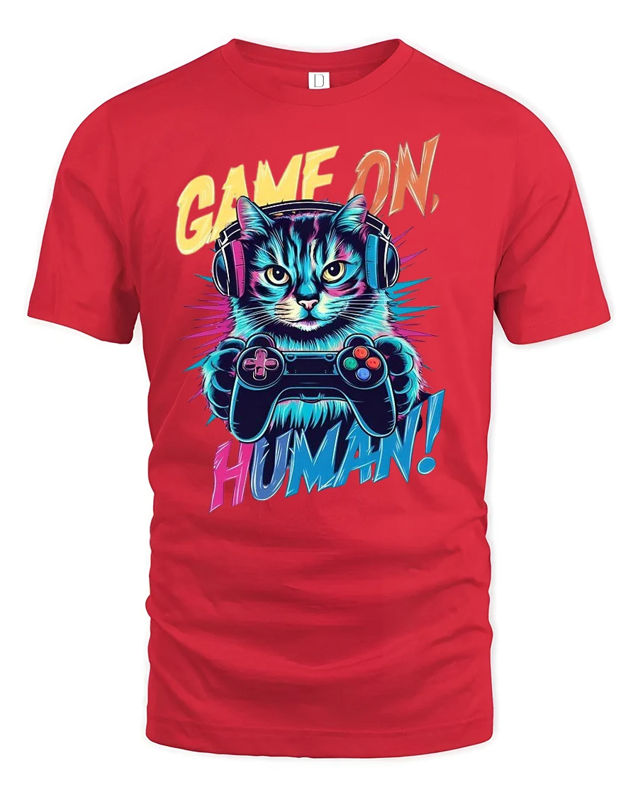 Funny Gamer Cat Headset Graphic Video Game Print Tee is the ultimate shirt for gaming enthusiasts who love cats and humor. Featuring a neon-style cat wearing a headset and holding a game controller with the bold phrase “Game On, Human!”, this tee is designed to stand out and make people smile. Its vibrant, futuristic colors give it a unique edge perfect for both casual wear and gaming sessions.