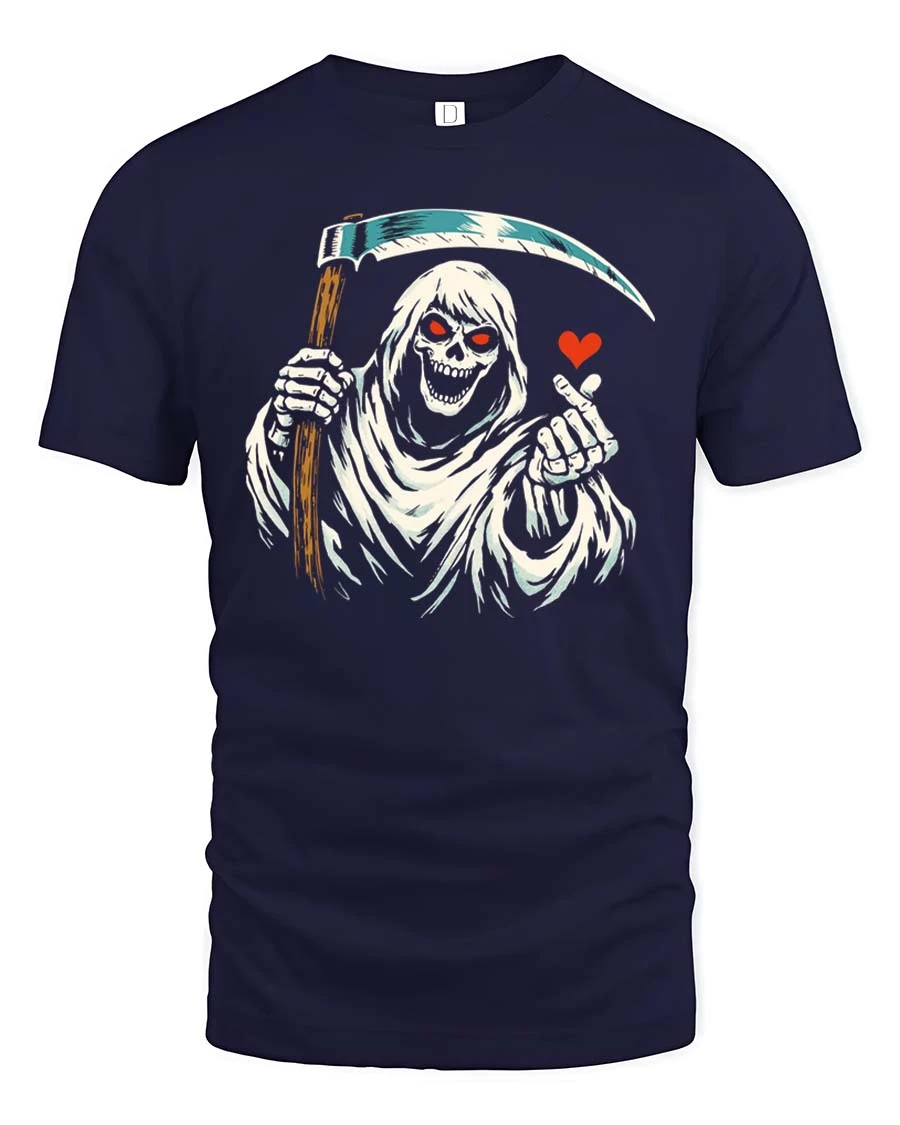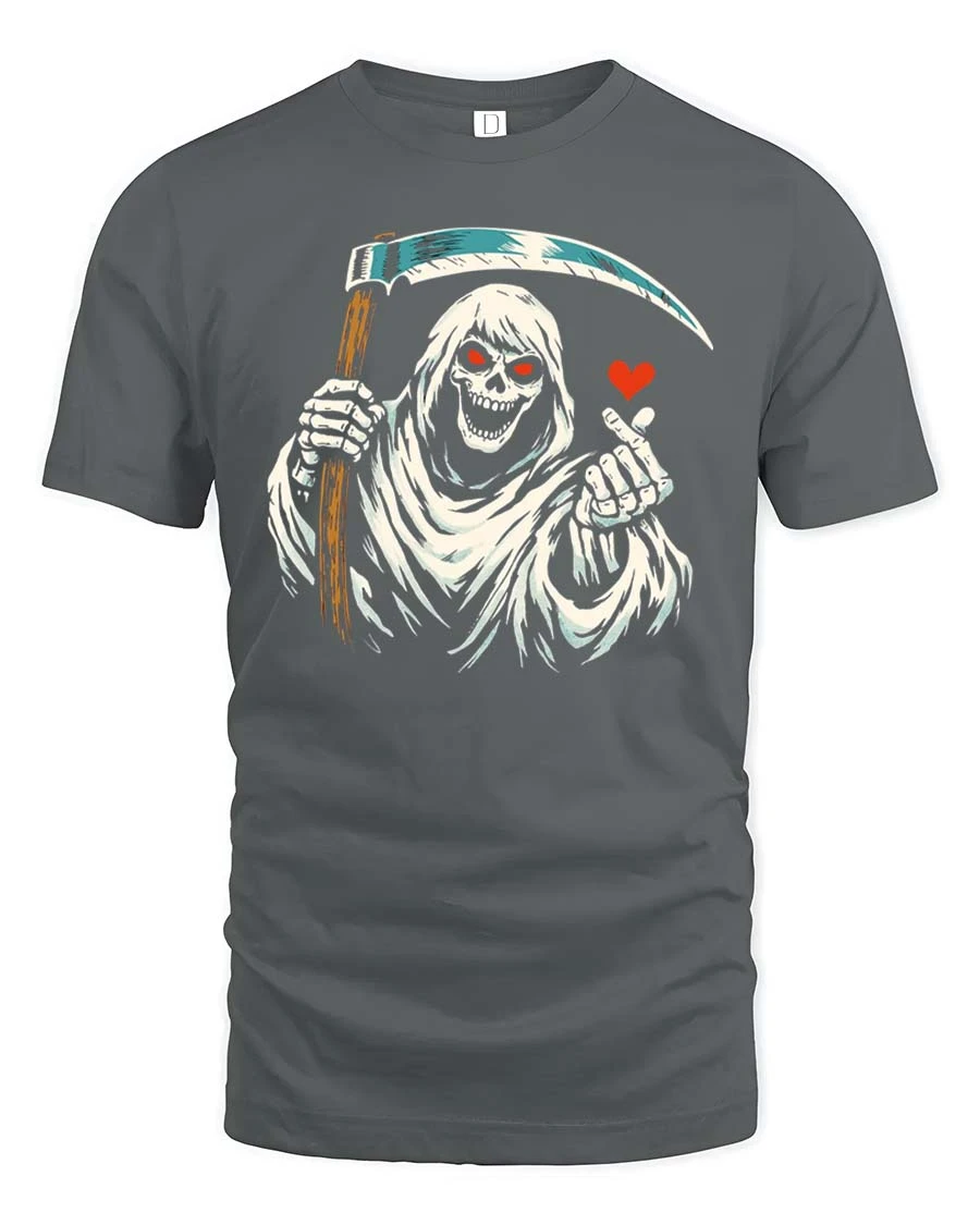 Funny Grim Reaper Love Finger Gothic Humor Graphic Tshirt blends dark humor with playful expression to create a memorable visual style.