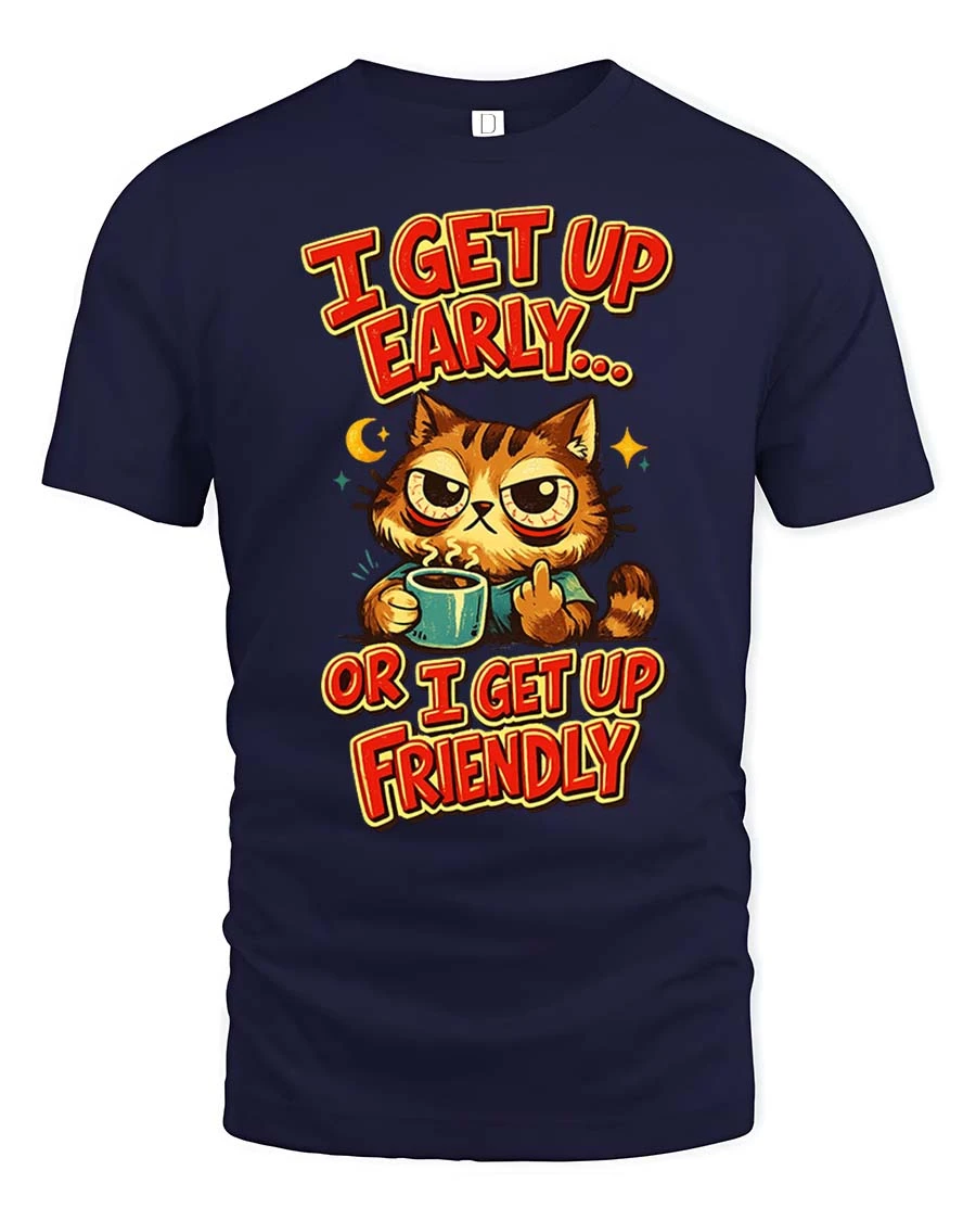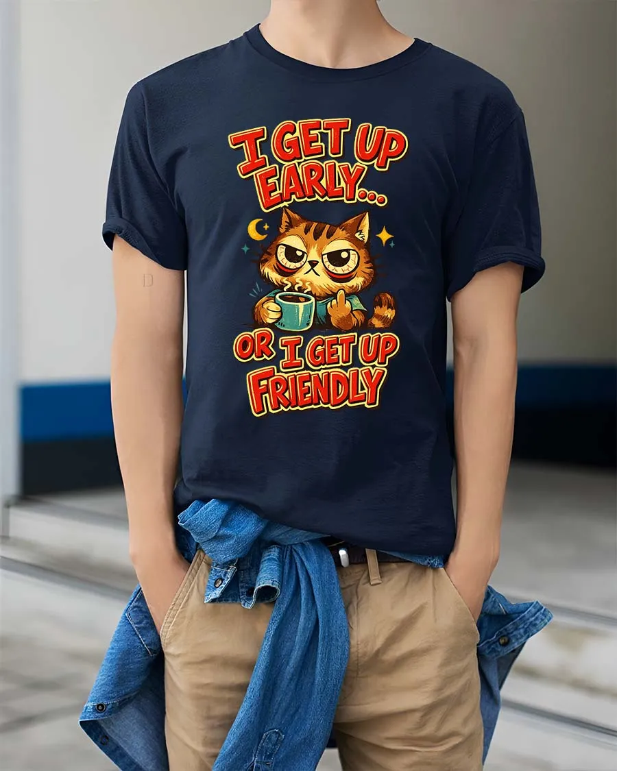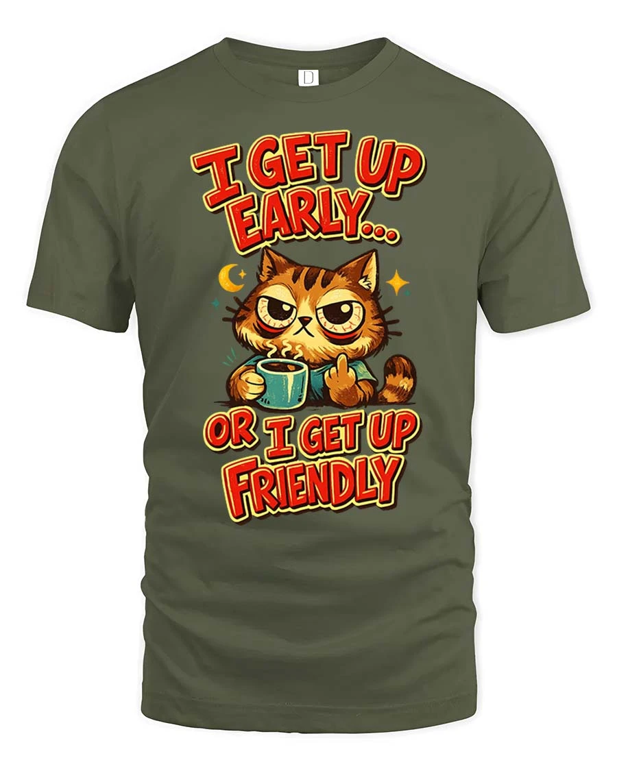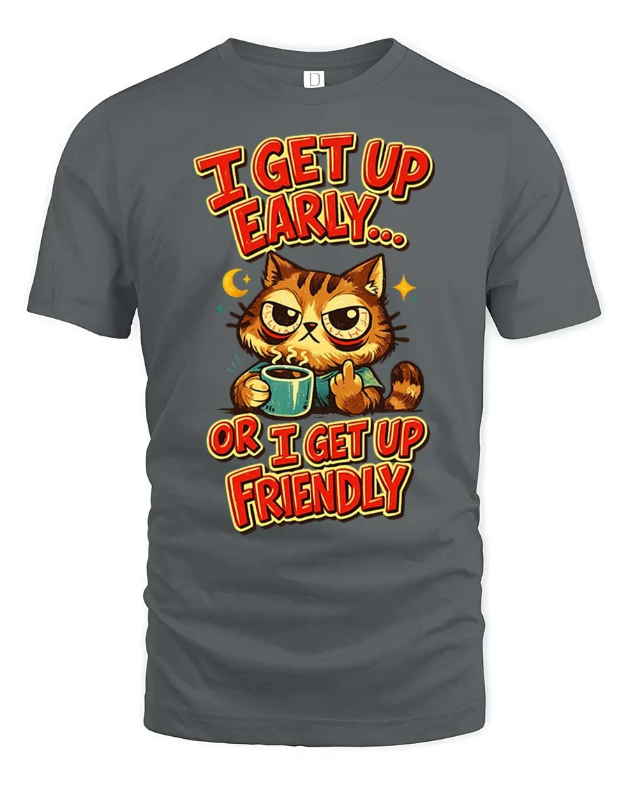 Funny Grumpy Cat Coffee I Get Up Early Humor Graphic Tshirt captures the relatable mood of early mornings with a humorous twist.