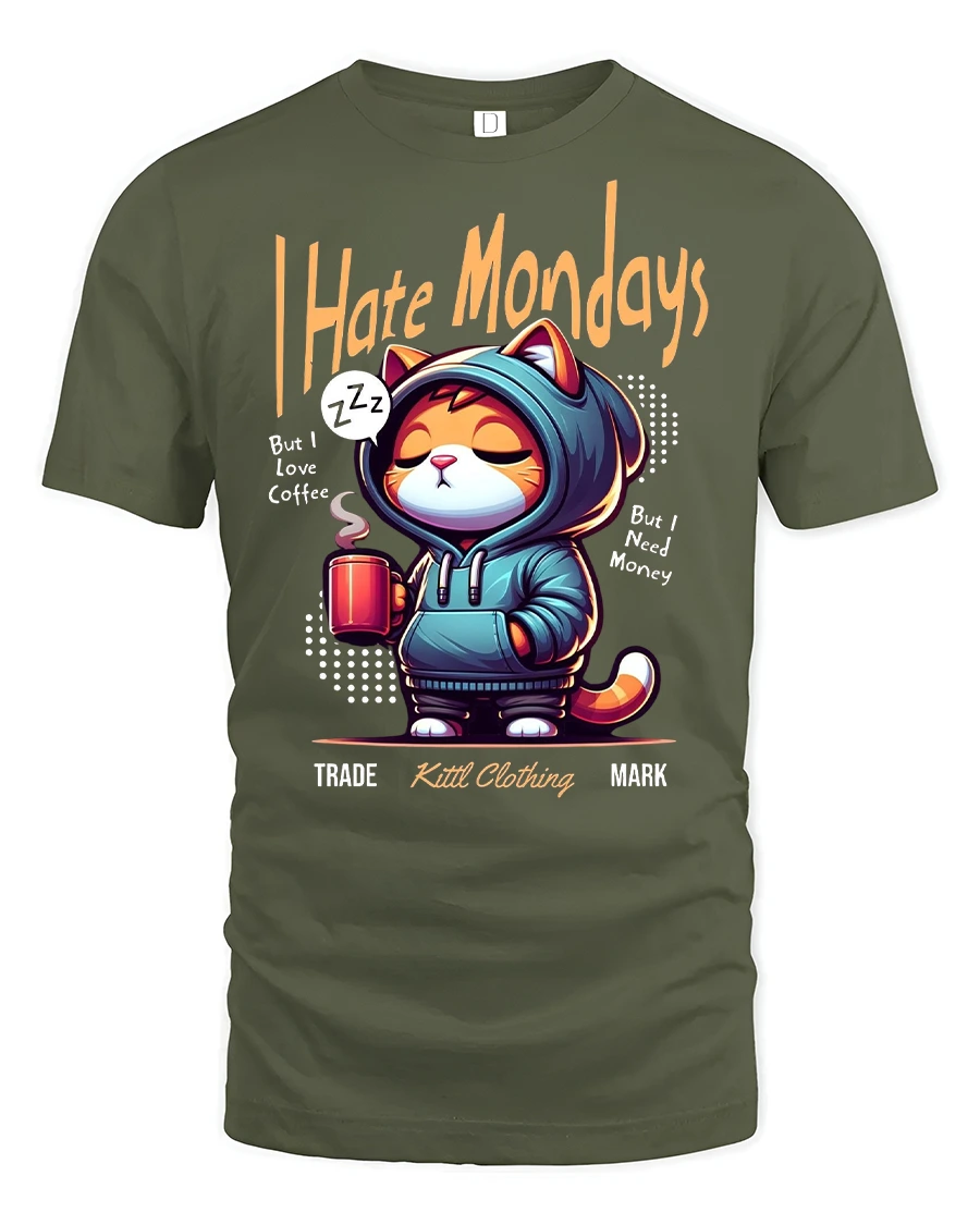Start your week with humor and style in the Funny I Hate Mondays Coffee Cat Graphic T-Shirt. Featuring a sleepy cartoon cat in a hoodie clutching a hot coffee mug, this tee perfectly captures the Monday morning mood. If you love coffee but hate Mondays, this funny design is sure to make everyone smile.