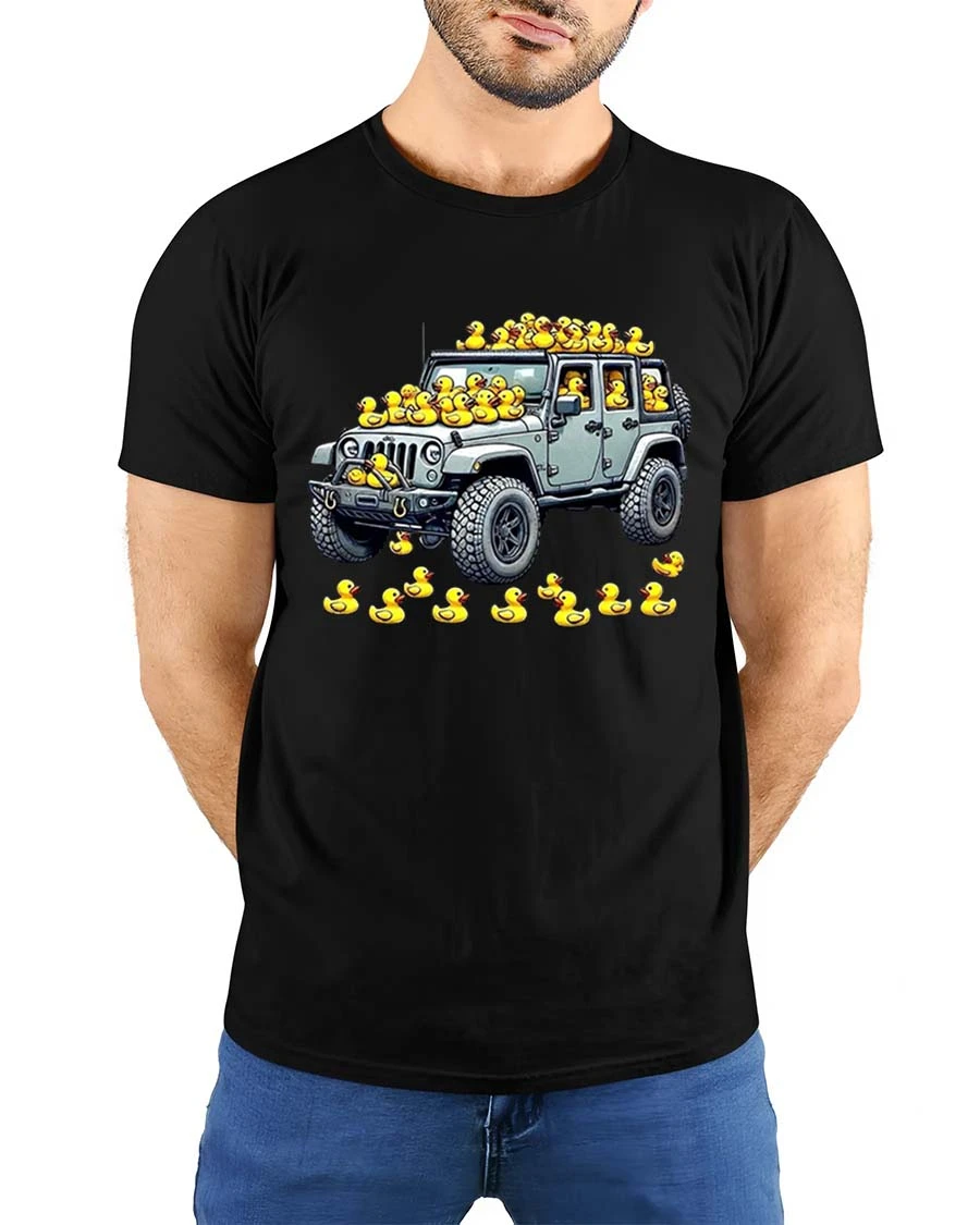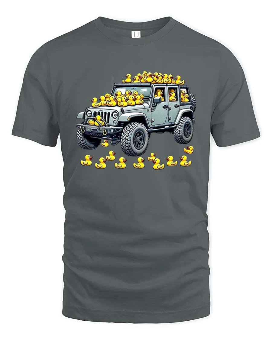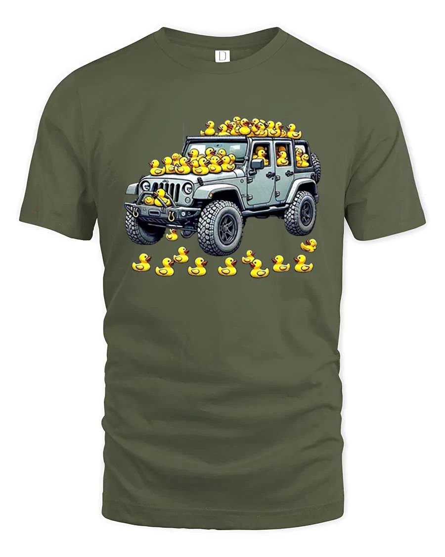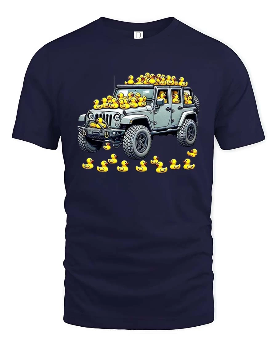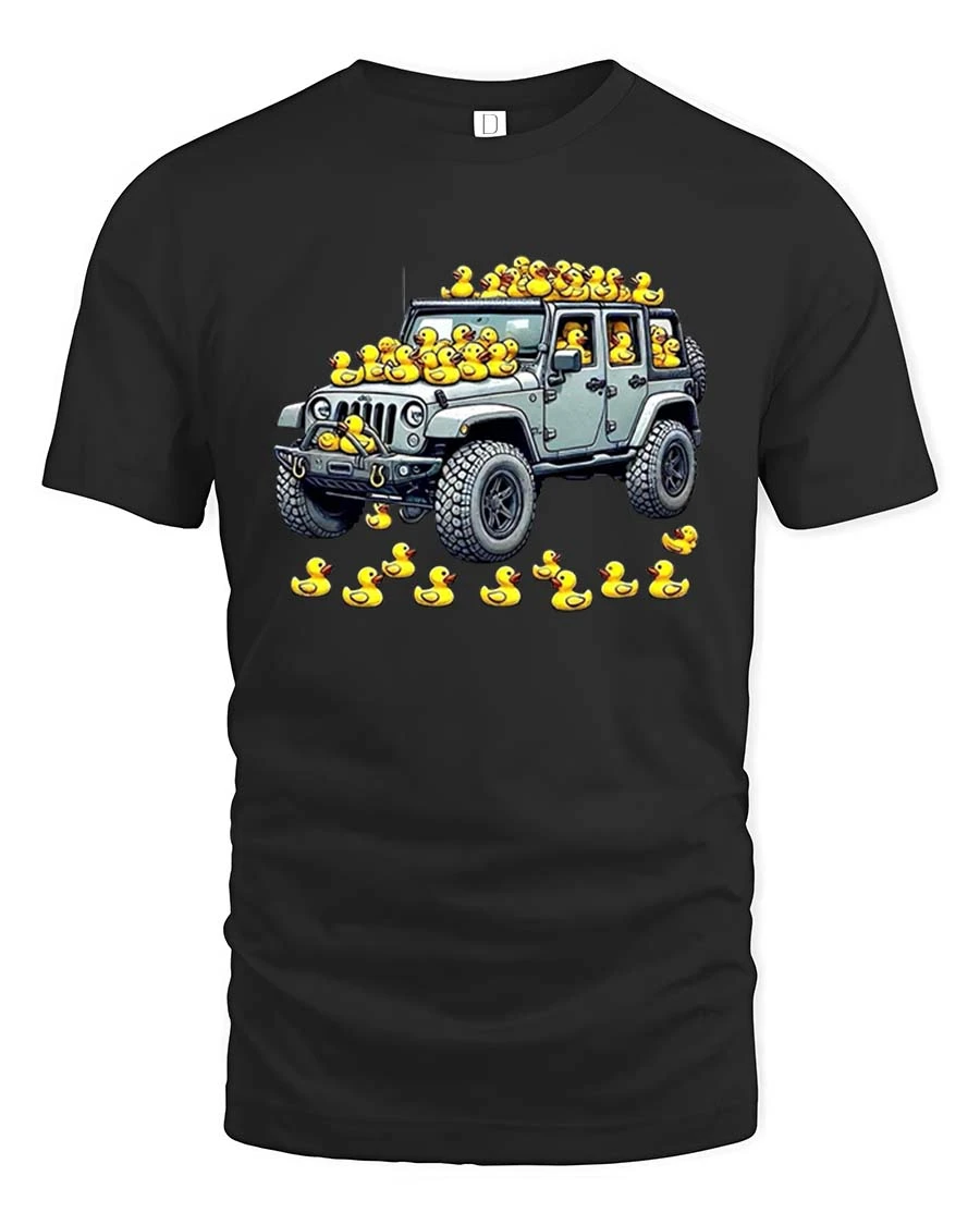 Funny Jeep Rubber Duck Offroad Driver T-Shirt Graphic Tee features a hilarious design of an off-road jeep covered in adorable rubber ducks.