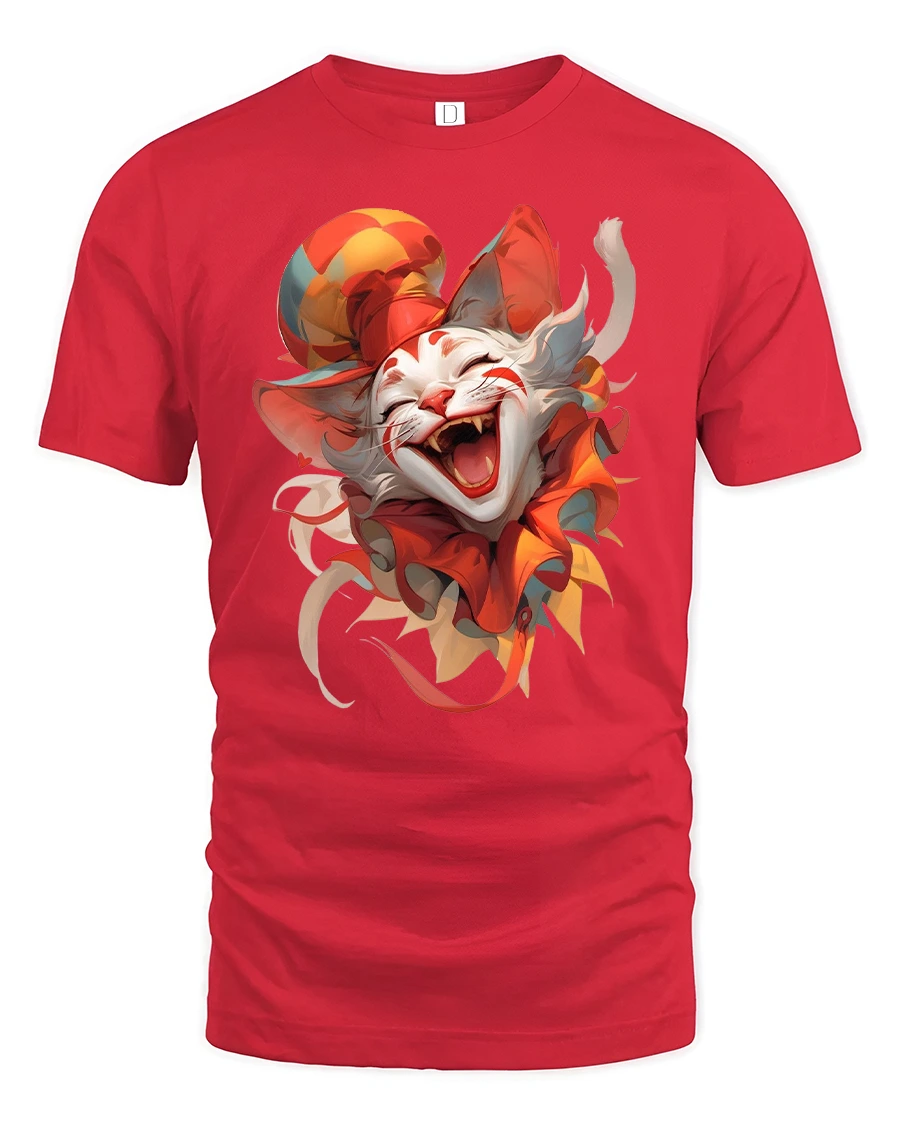 Featuring a mischievous cat dressed as a jester, bursting into laughter with bright red and orange tones, this design perfectly captures wild feline fun and theatrical flair.