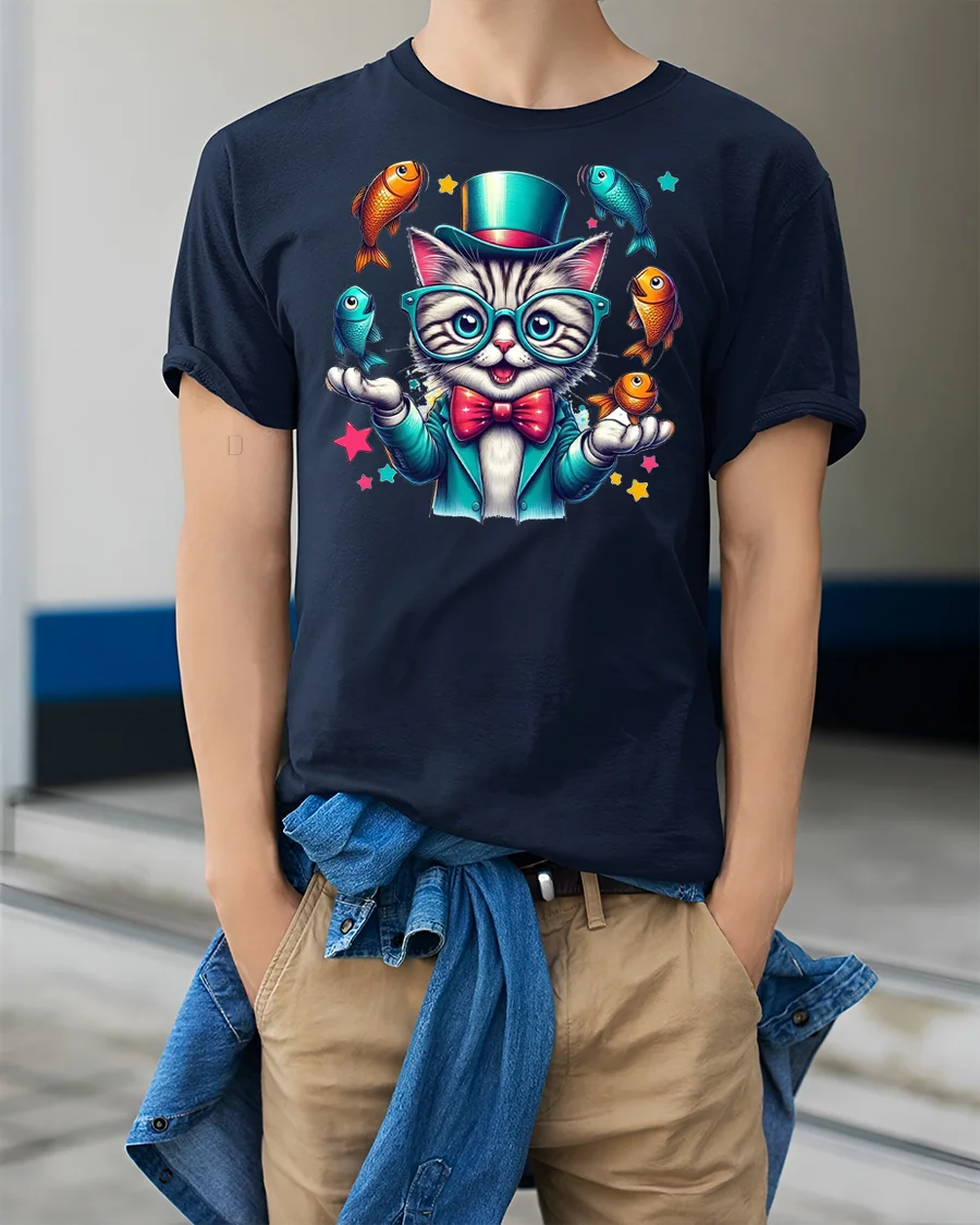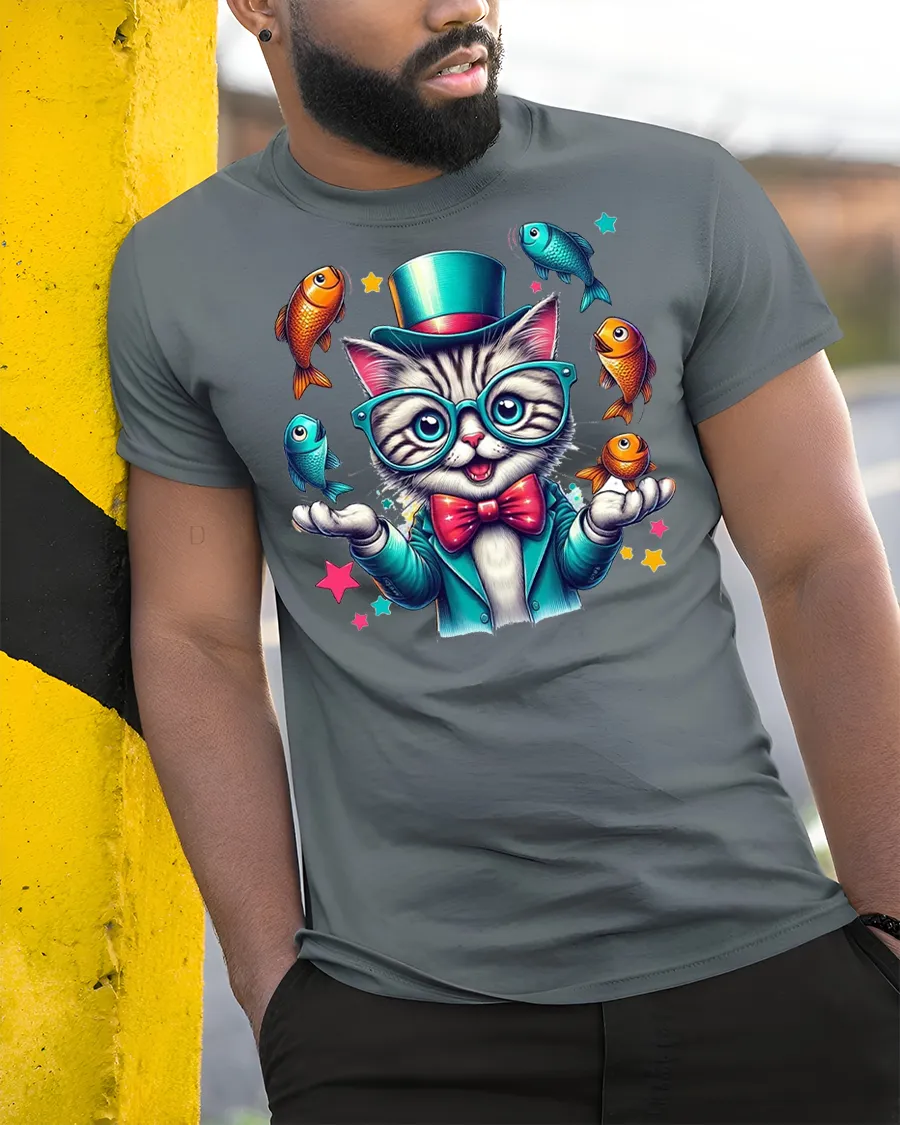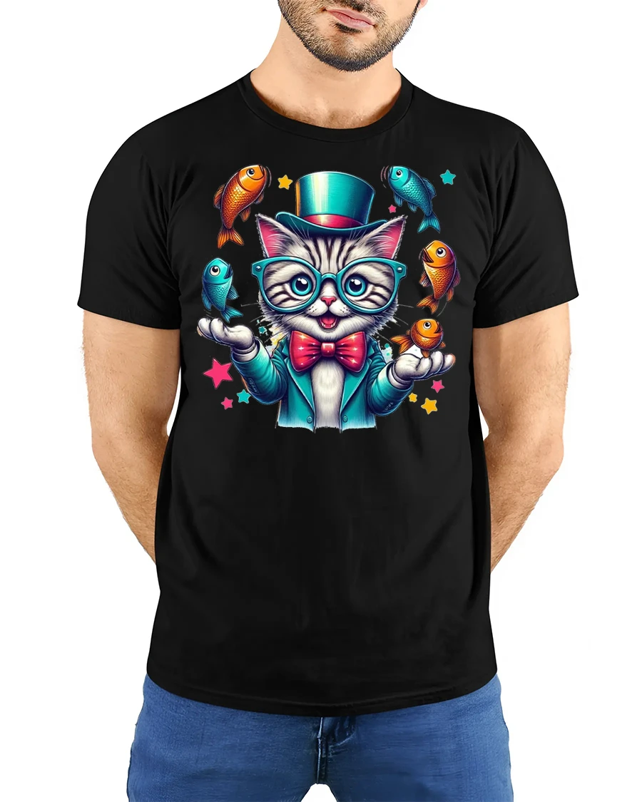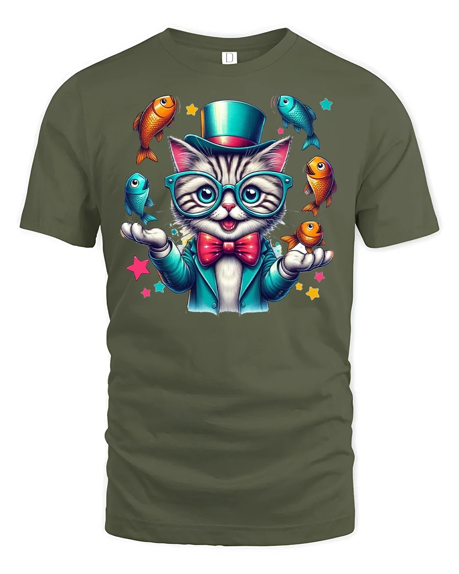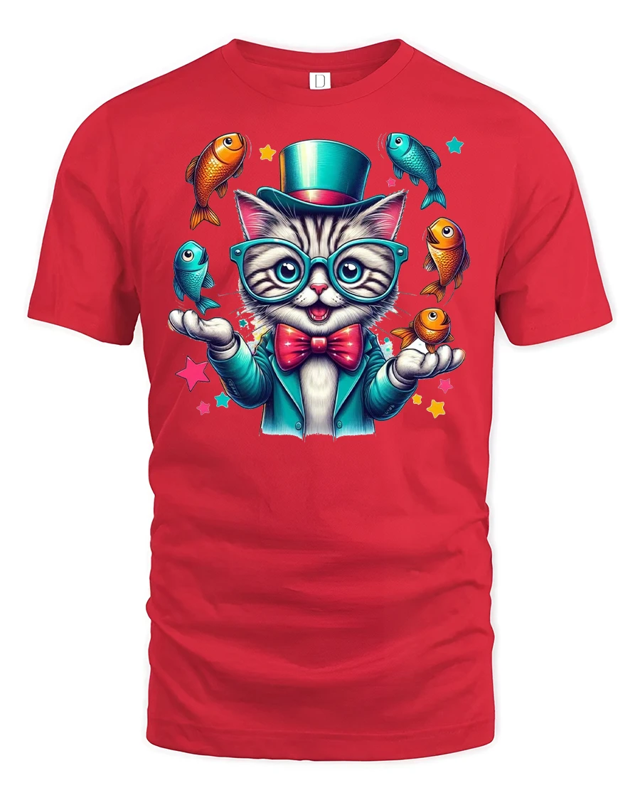 Funny Juggling Cat Tee with Fish Circus Style Tshirt is the ultimate blend of humor, color, and quirky character design. Featuring a stylish cat in a top hat, oversized glasses, and a bow tie while juggling colorful fish, this tee is perfect for anyone who loves playful and eye-catching fashion. The cartoon-style artwork makes it fun, bold, and full of personality.
