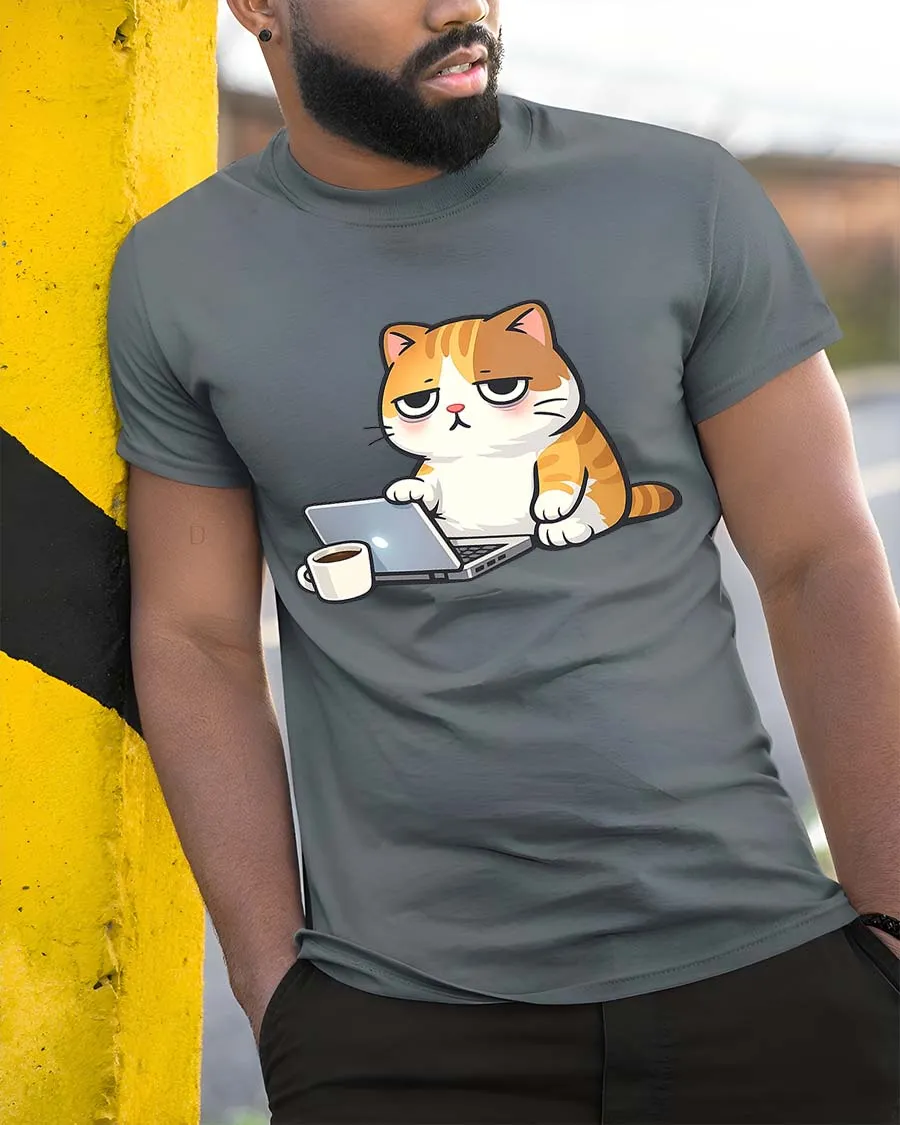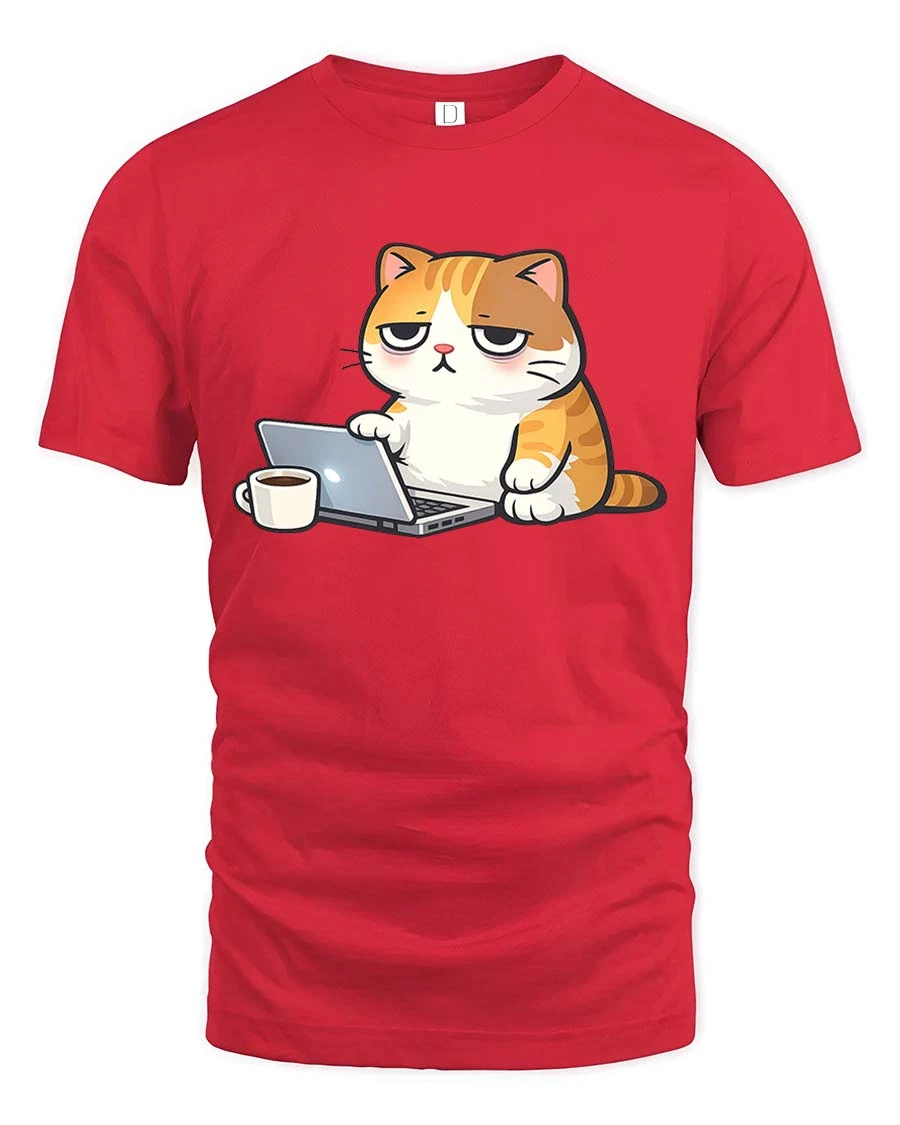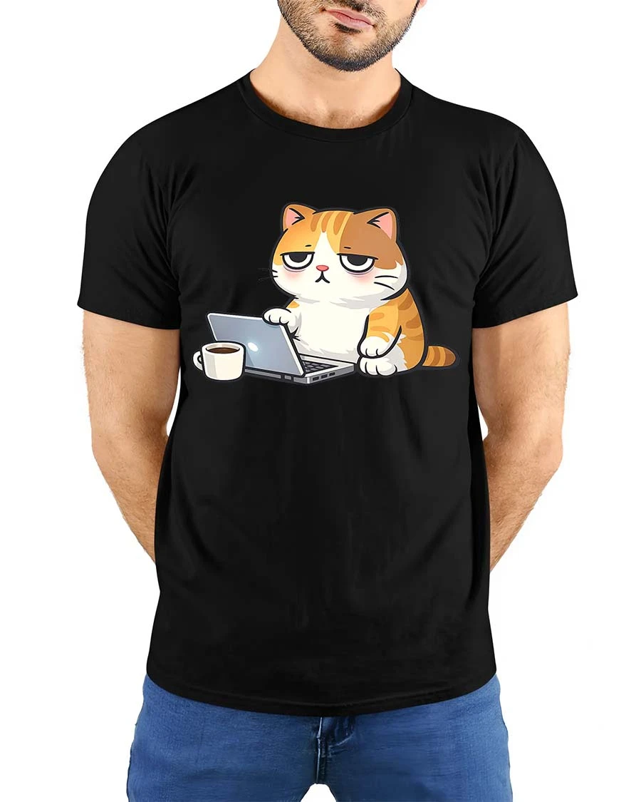 Funny Lazy Cat Working On Laptop Coffee Cartoon Tshirt features a humorous cat character showing a tired expression while using a laptop and enjoying coffee.