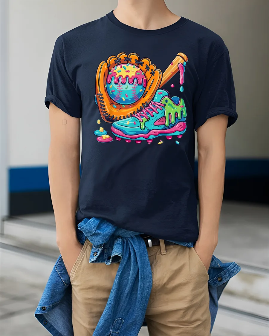 Funny Melting Baseball Gear Tee With Colorful Street Art Vibes pairs easily with jeans shorts or sneakers.