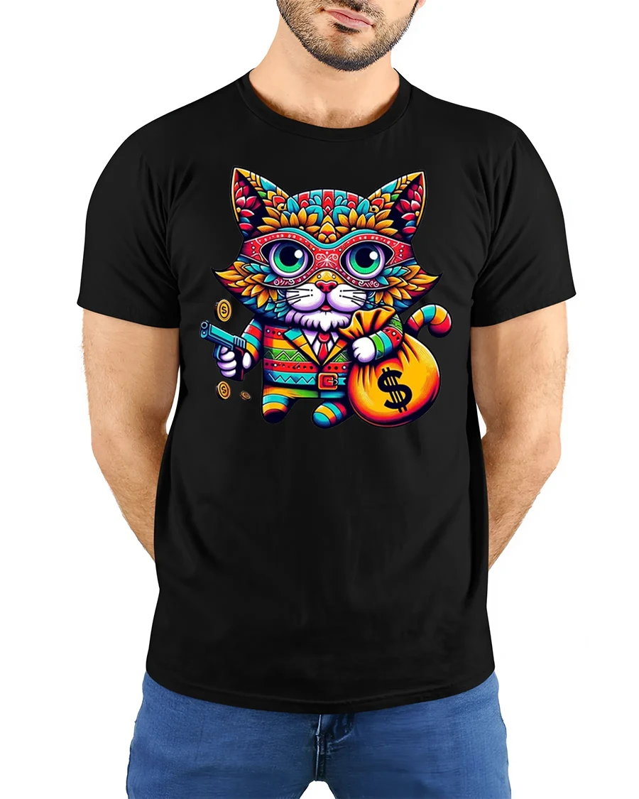 This tee features a bold, colorful cat holding a cash bag and coin details, creating the perfect mix of cute and mischievous.