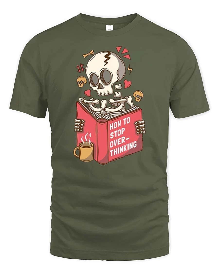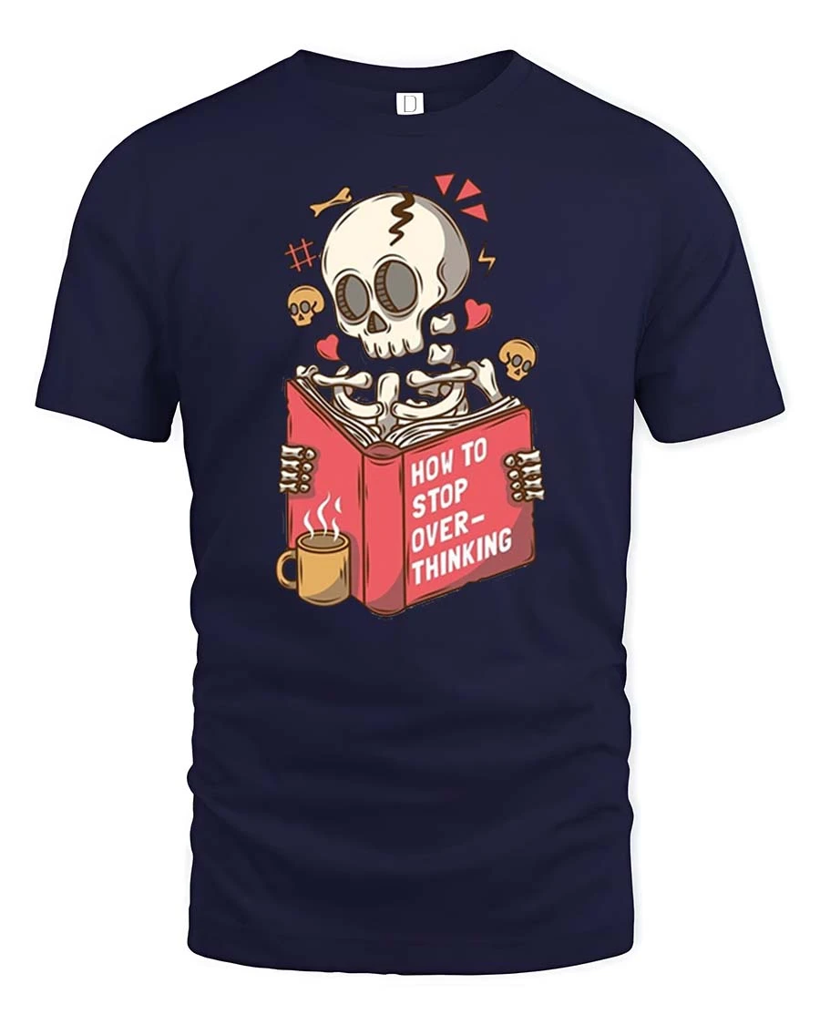 This funny overthinking skeleton t-shirt features a humorous design of a skeleton reading a book titled about stopping overthinking.