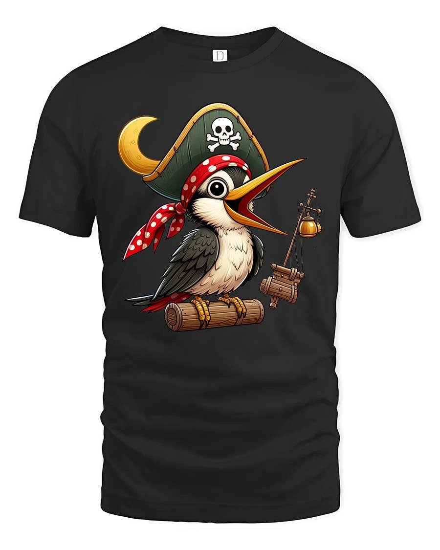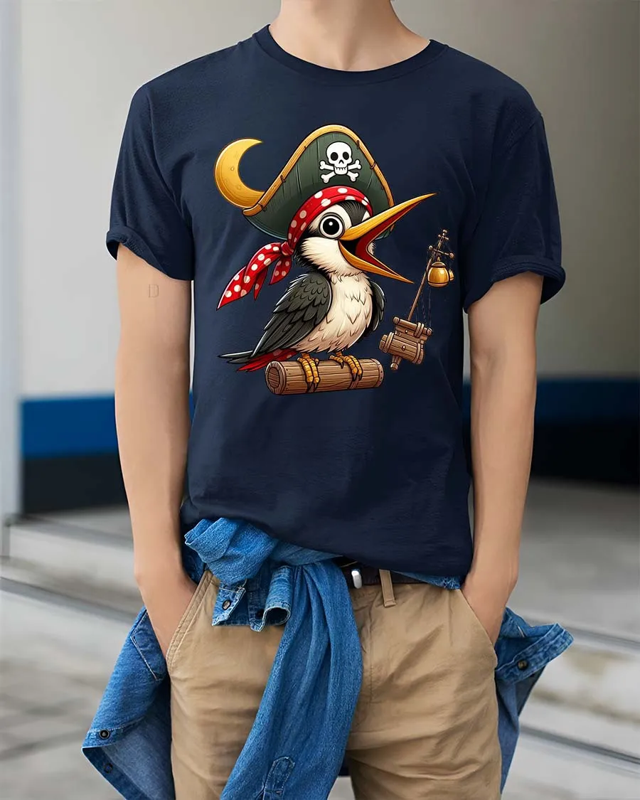 Funny Pirate Bird Cartoon Adventure Cute Graphic Tshirt features a playful bird character dressed as a charming pirate in a detailed cartoon style.
