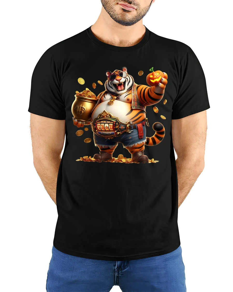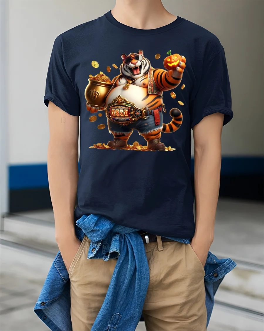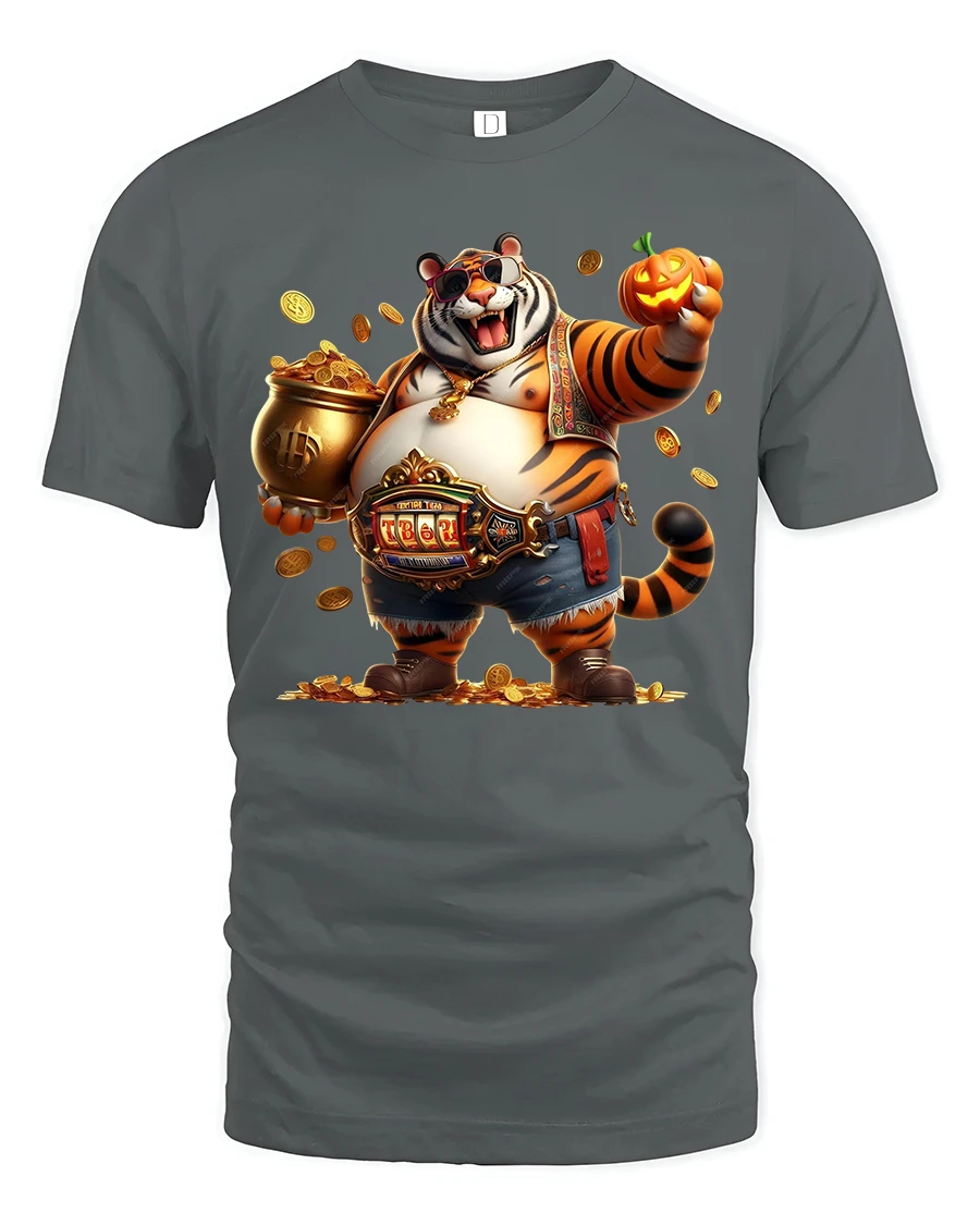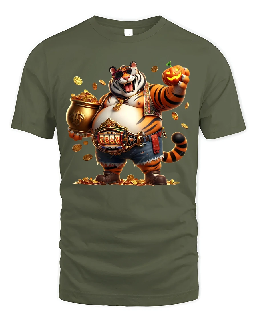 Featuring a cheerful tiger surrounded by gold coins, wearing shades and holding a pumpkin, this tee blends humor, wealth, and cool vibes in one eye-catching design.