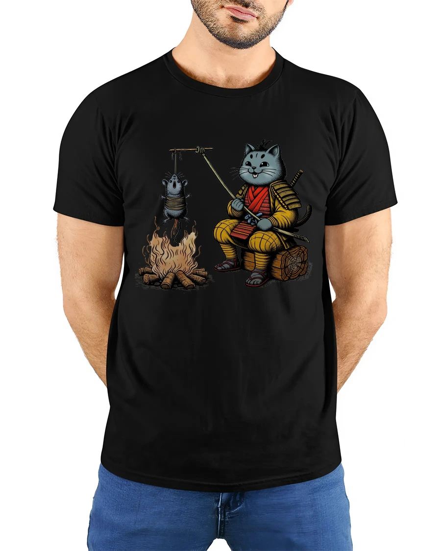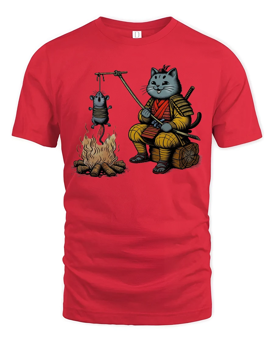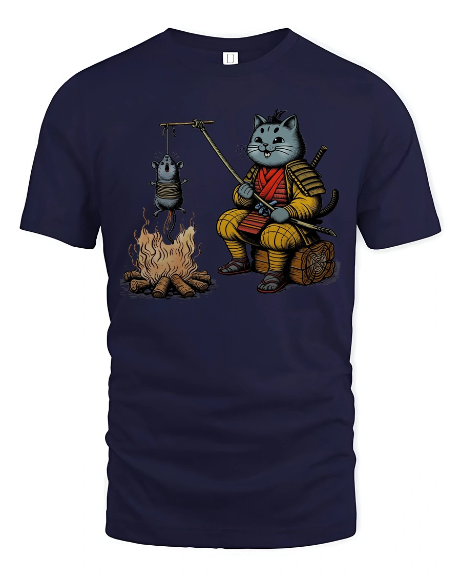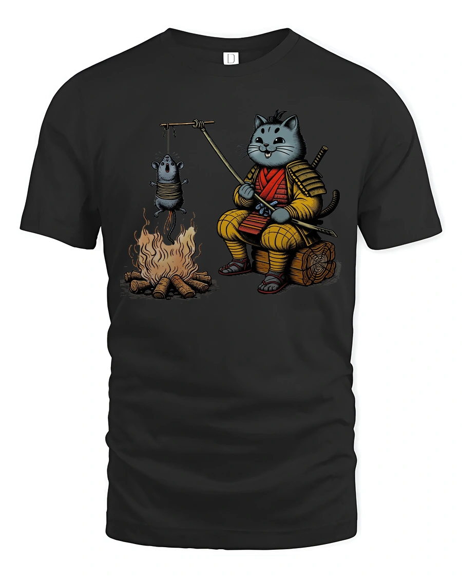 Add humor and charm to your wardrobe with this Funny Samurai Cat Roasting Mouse T Shirt Cute Ninja Tee. The playful design features an adorable samurai cat in traditional armor sitting by a campfire while roasting a tiny mouse on a stick. This creative artwork blends warrior spirit with cartoon cuteness, creating a unique and eye catching graphic that sparks smiles and conversation.