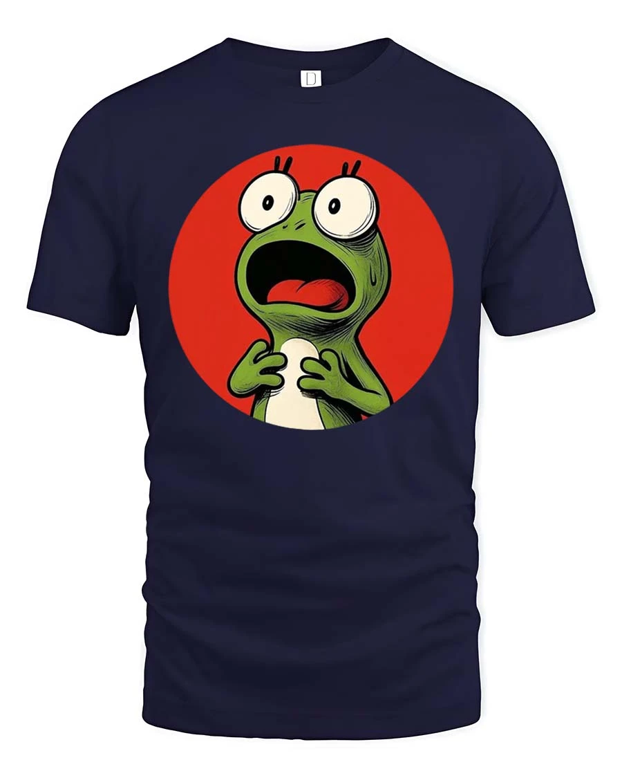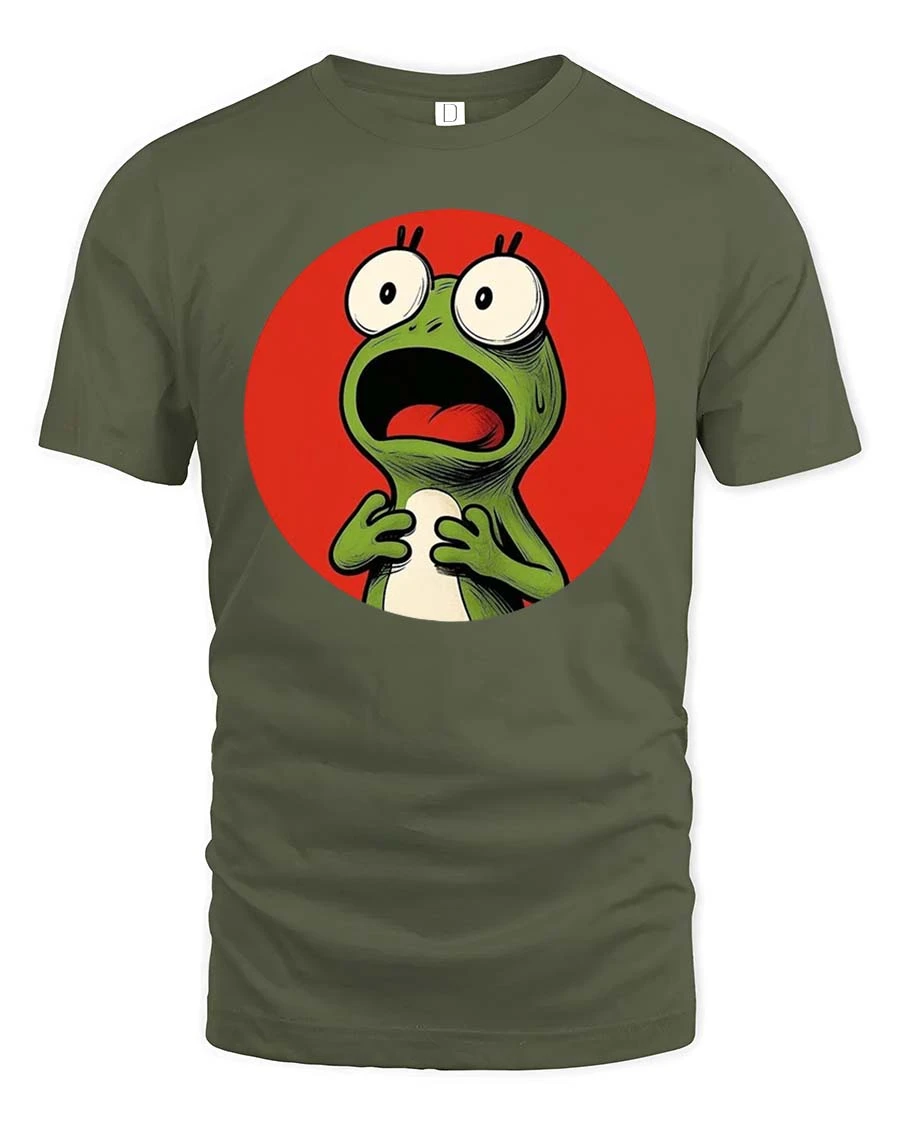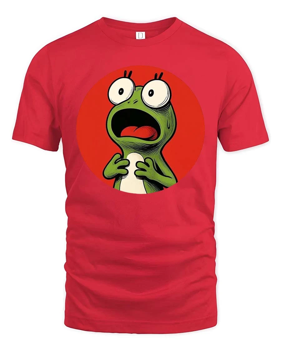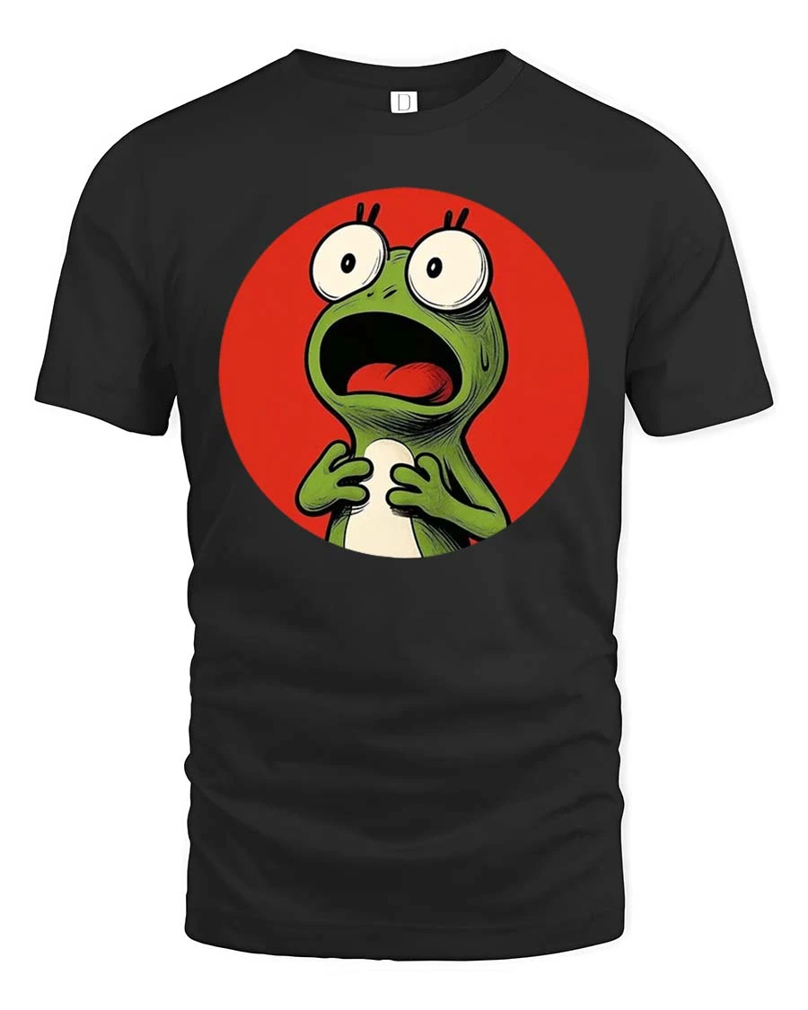 Featuring a wide-eyed shocked frog with a hilarious reaction expression, this graphic instantly captures attention and adds a fun vibe to any outfit.