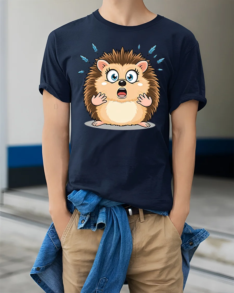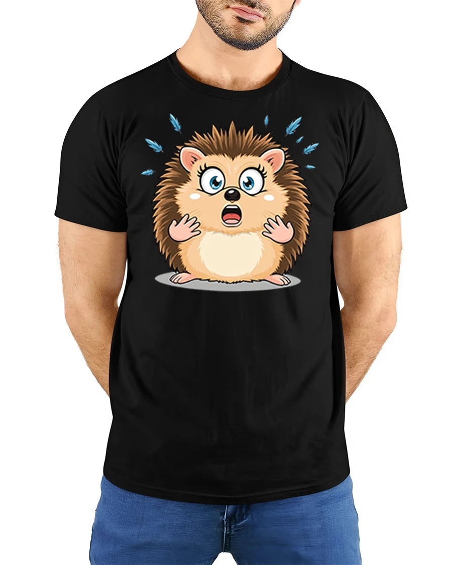 Funny Shocked Hedgehog Cartoon Tee With Cute Surprised Face Art pairs effortlessly with jeans shorts or casual outfits.