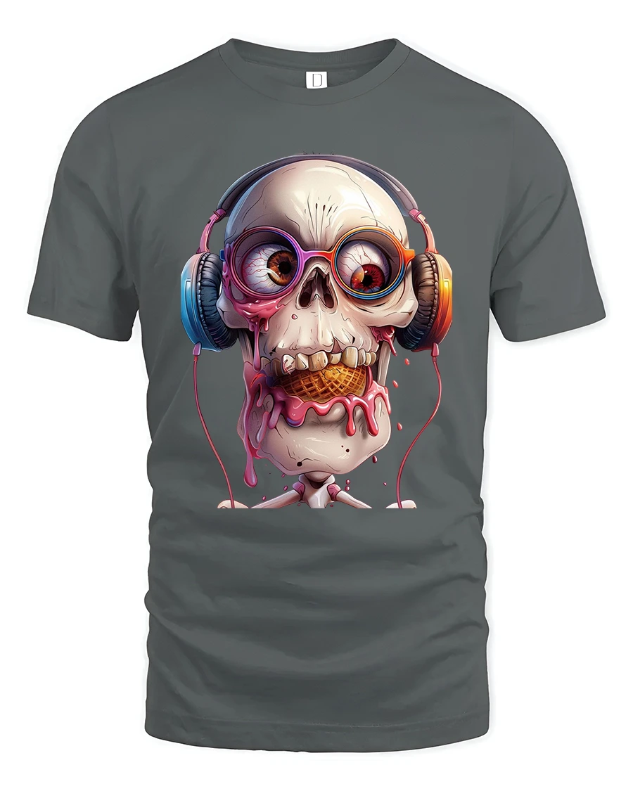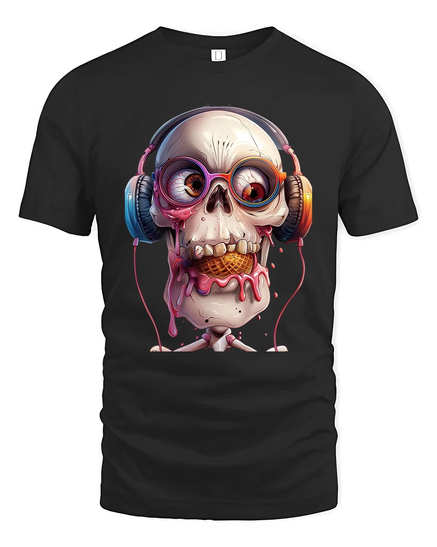 This skull headphones t shirt features a detailed skull wearing colorful headphones while enjoying a melting ice cream cone creating a surreal and playful visual impact.