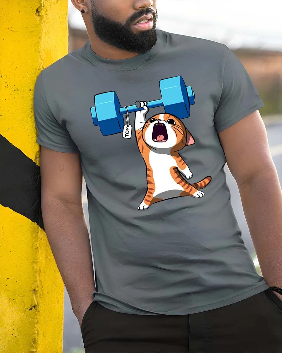 Funny Strong Cat Weightlifting Cartoon Gym Graphic T-Shirt Tee delivers a playful mix of humor and motivation through a charming illustrated design.