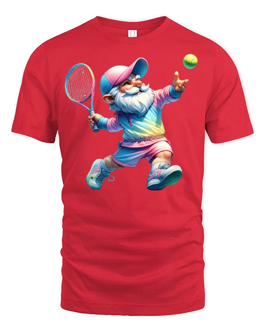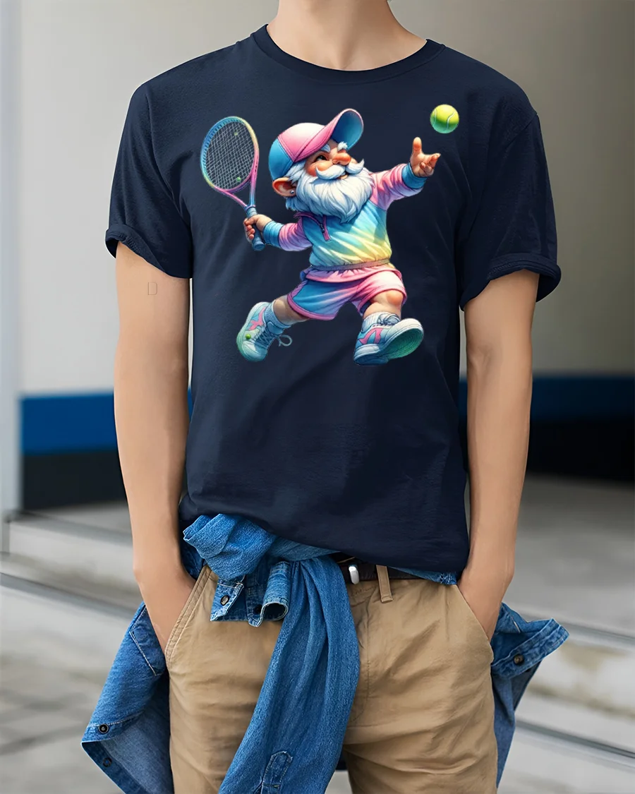 Featuring a cheerful gnome in a colorful rainbow outfit mid-serve with his tennis racket, this design adds fun energy and charm to your casual wear.